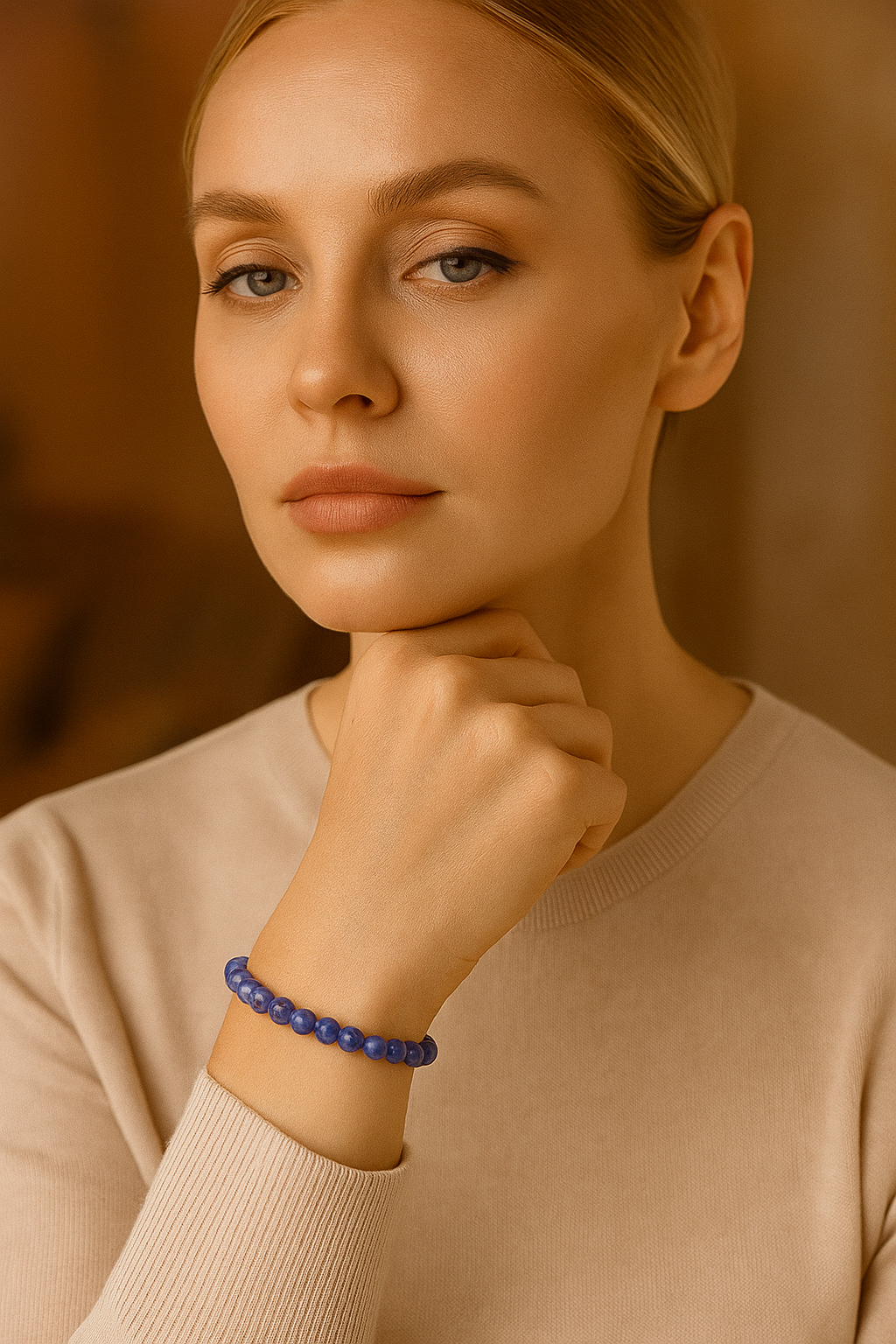 Derin lacivert tonları üzerinde doğal beyaz damarlarıyla dikkat çeken sodalit taşı, bu özel bileklikte 6 mm yuvarlak kesim formunda dizilmiş ve sade, dengeli bir tasarımla tamamlanmıştır. Renk kontrastı ve mat yapısıyla bilekte zarif, doğal ve güçlü bir duruş sergiler.