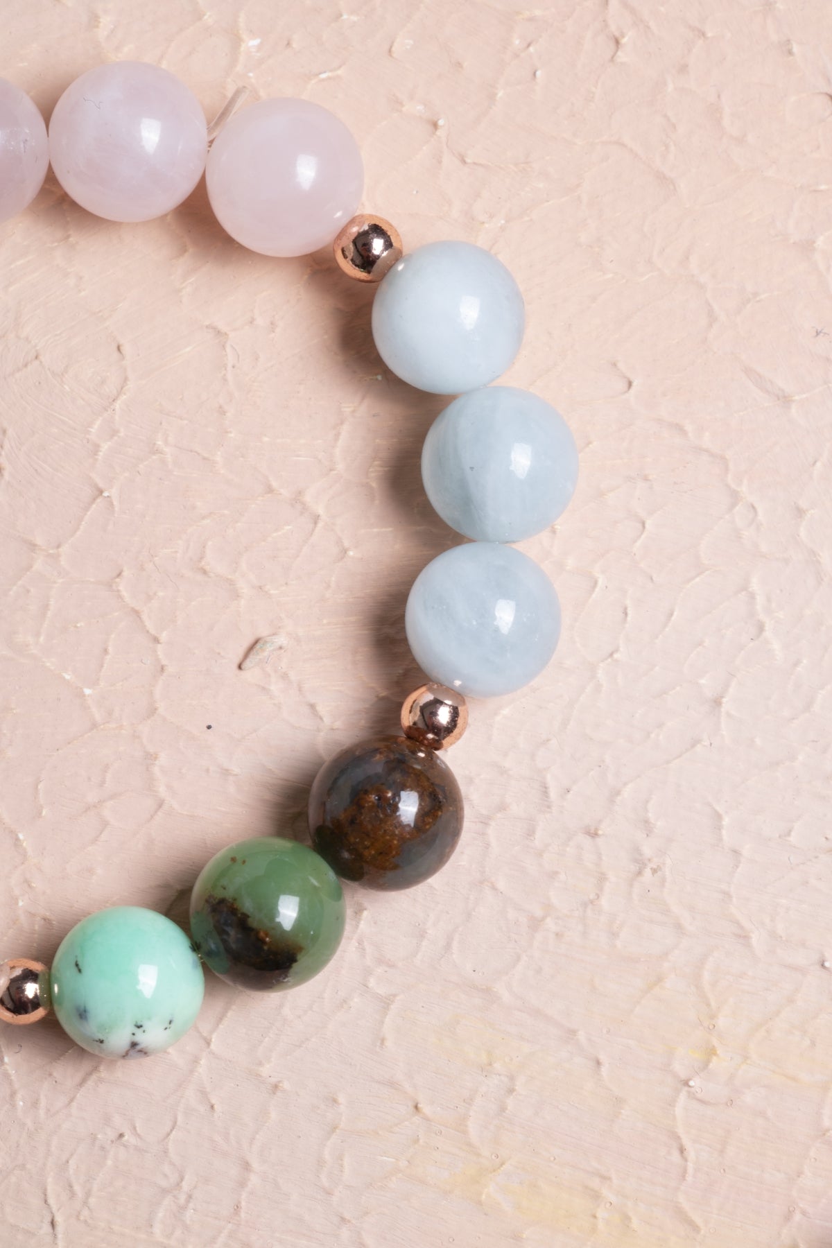 Zarafet, denge ve uyum arayışıyla öne çıkan Terazi burcuna özel olarak tasarlanan bu bileklik, estetik bakış açısına ve ruhsal uyuma hitap eden beş farklı doğal taşın bir araya gelmesiyle oluşturulmuştur.