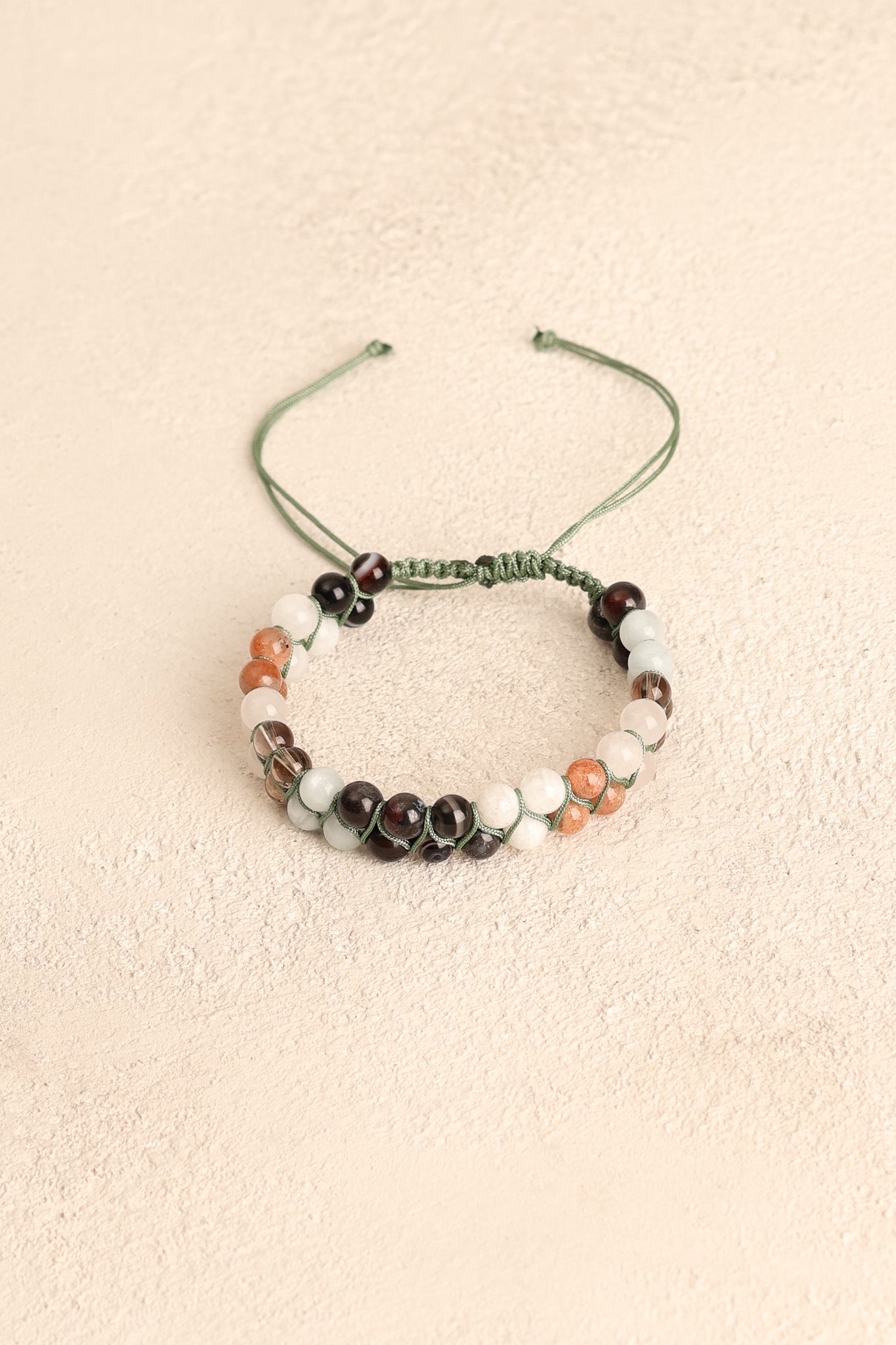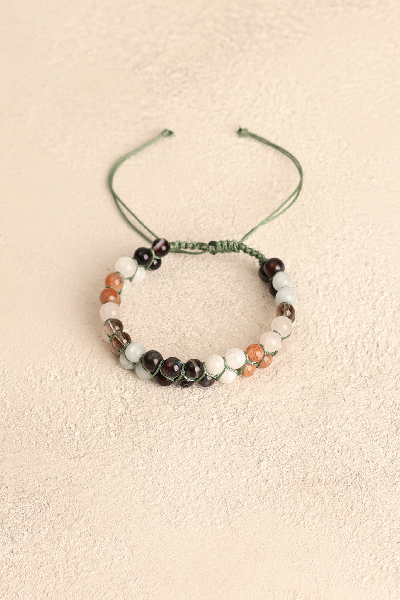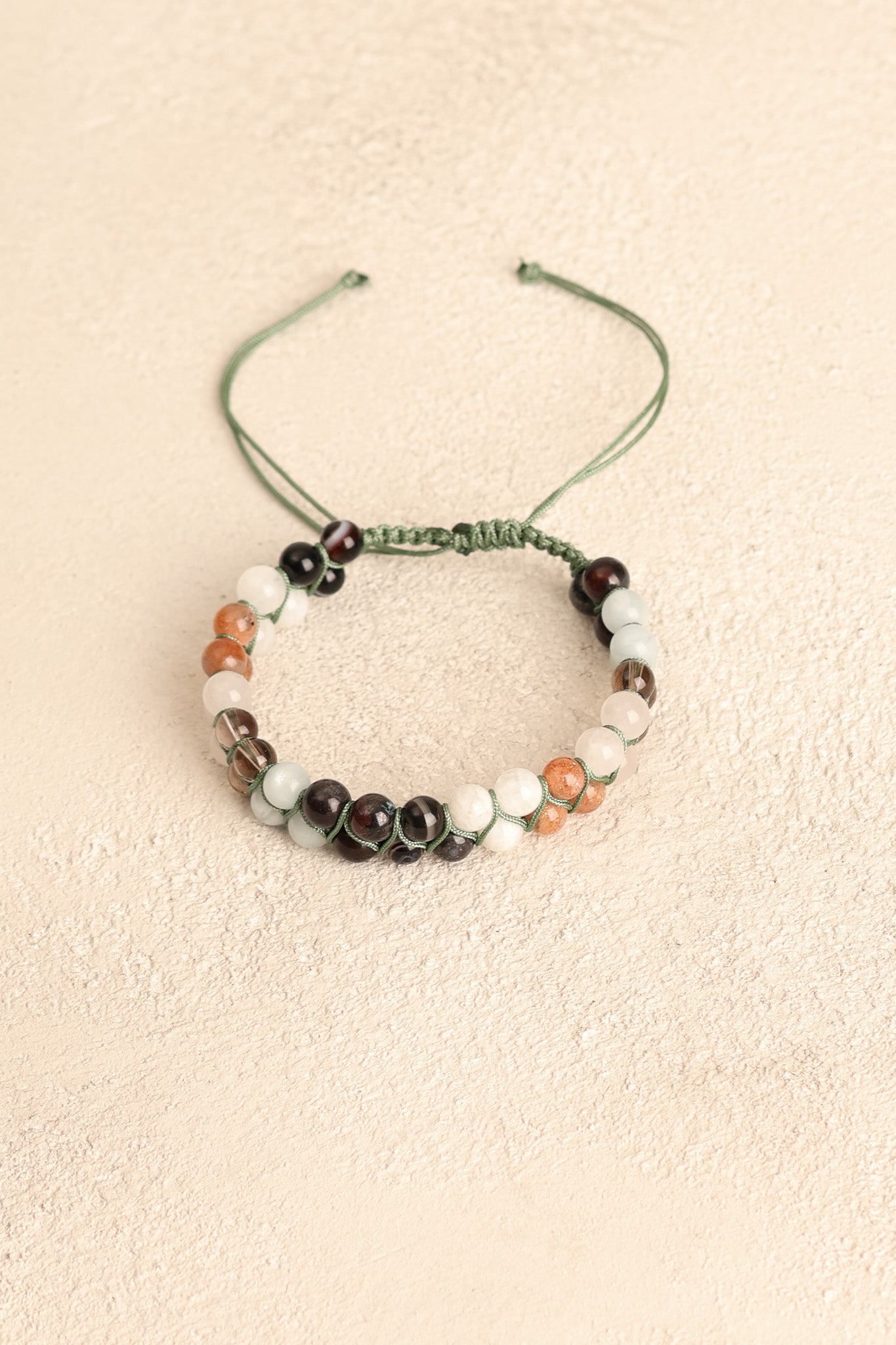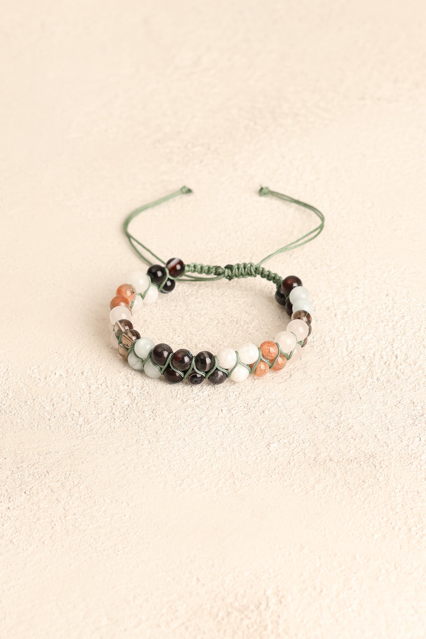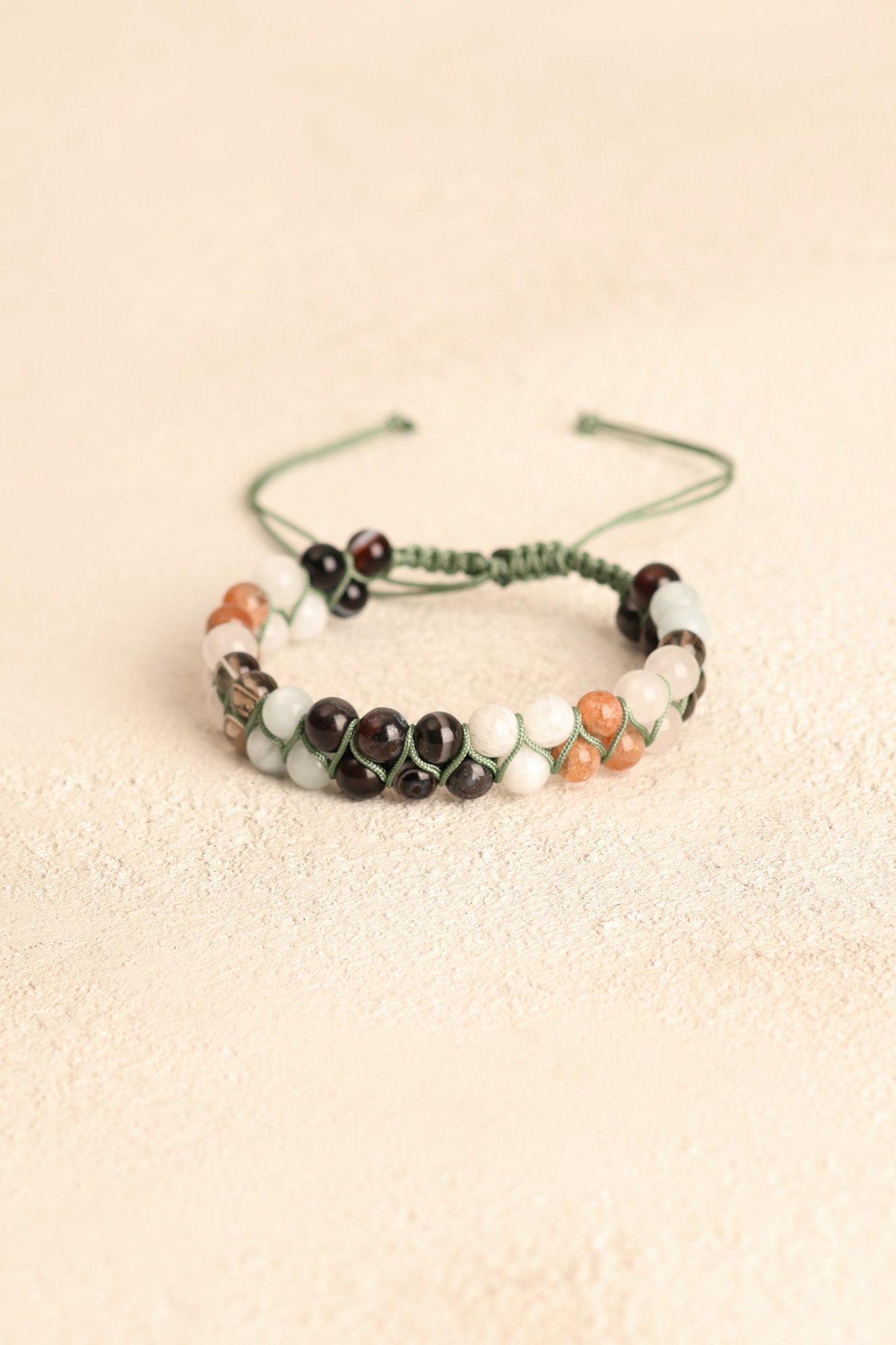 Zarif, dengeli ve uyumlu yapısıyla öne çıkan Terazi burcuna özel olarak tasarlanan bu bileklik, burcun doğasına uyumlu seçilmiş 8 farklı doğal taşın çift sıra dizilimiyle hazırlanmıştır.