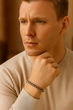 Gri, bej, kahverengi ve hafif yeşilimsi tonların doğal desenlerle birleştiği Trehartz taşı, bu özel bileklikte 6 mm yuvarlak kesim formunda dizilmiş ve sade ama güçlü bir tarzla hazırlanmıştır. Her taş, yüzeyindeki benzersiz desenlerle bilekte karakterli ve doğal bir duruş sunar.