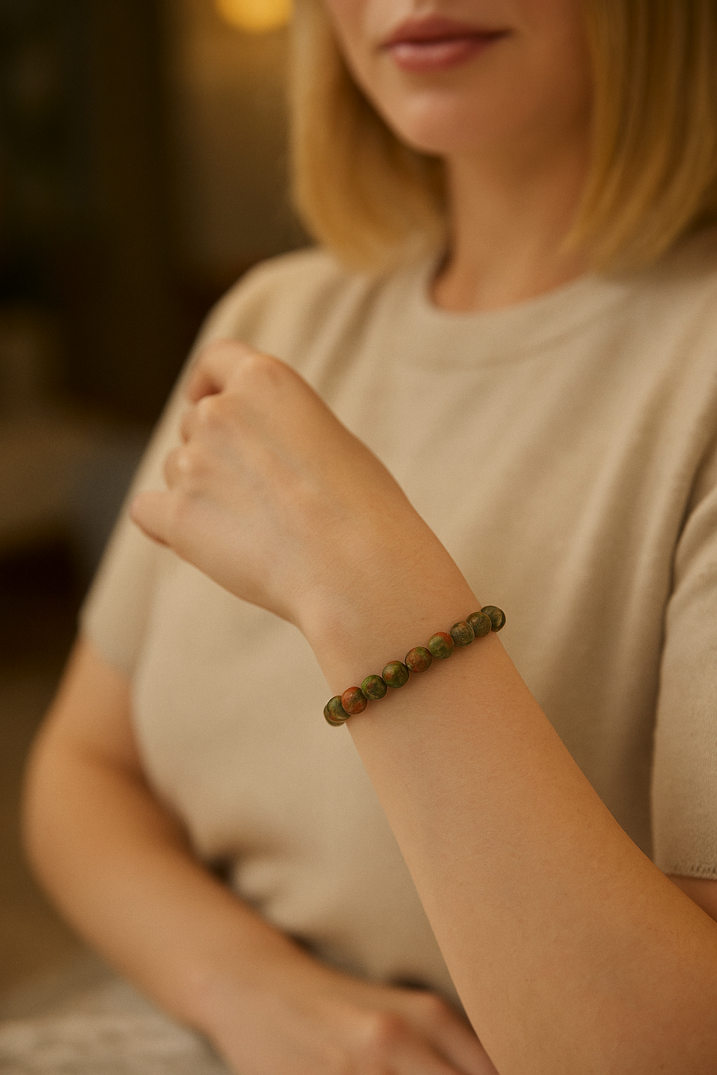 Bej, açık gri, kahverengi ve yeşilimsi toprak tonlarının özgün birleşimiyle dikkat çeken trehartz taşı, bu özel bileklikte 8 mm yuvarlak kesim formunda dizilmiş ve doğadan ilham alan sade ama güçlü bir görünümle sunulmuştur. Taşların doğal desen ve renk geçişleri, bilekte dengeli ve karizmatik bir duruş sağlar.