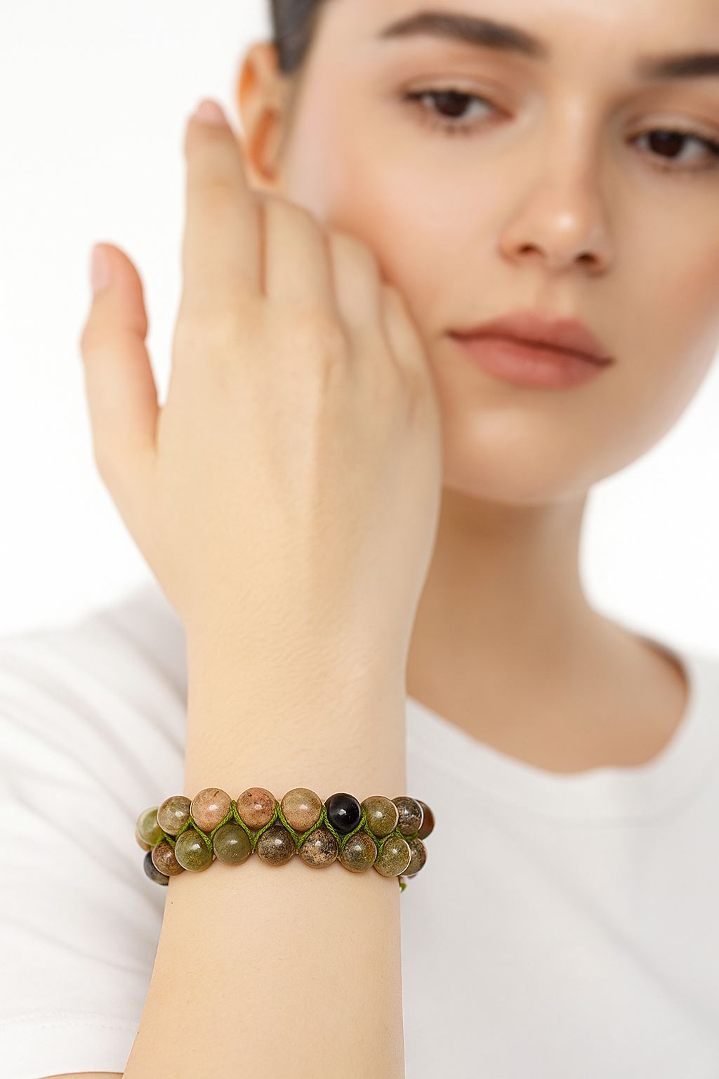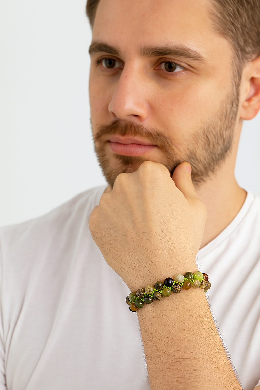 Canlı ve derin yeşil rengiyle dikkat çeken, nadir bulunan granat türlerinden Tsavorit Lal, bu özel bileklikte 8 mm yuvarlak kesim taşlarla hazırlanmış ve çift sıra el yapımı makrome örgü ile sunulmuştur. Zarif parlaklığı ve dengeli dizilimiyle hem doğal hem lüks bir duruş sergiler.
