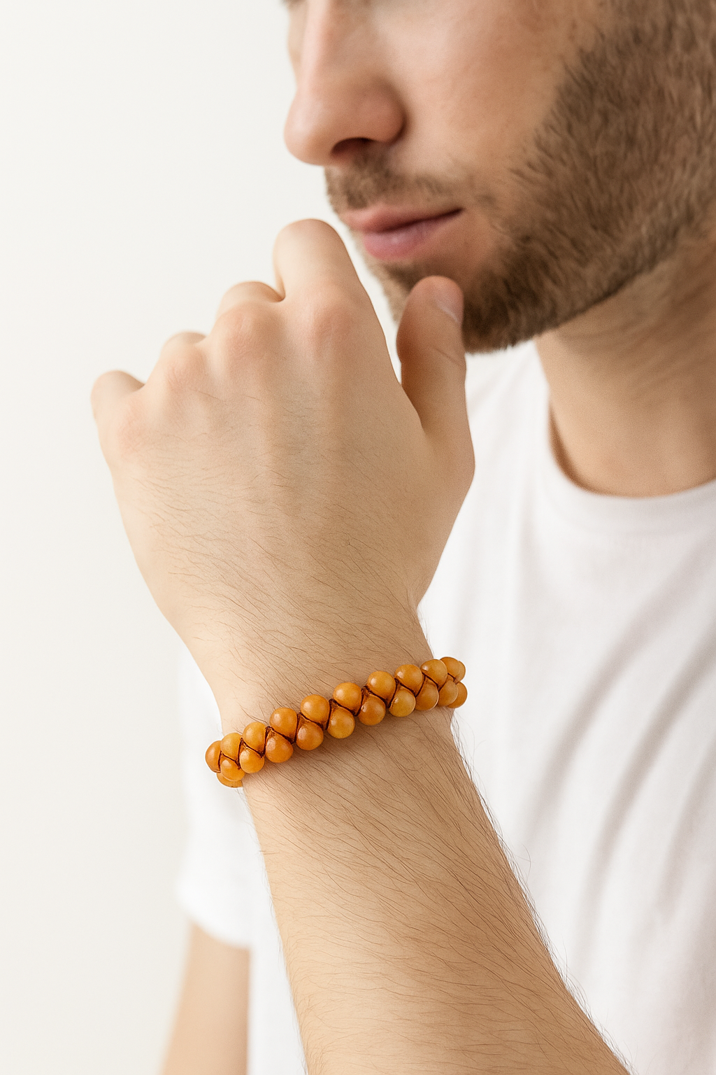 Sıcak turuncu, kayısı ve tarçın tonlarıyla enerjik bir görünüm sunan turuncu aventurin taşı, bu özel bileklikte 8 mm yuvarlak kesim formunda dizilmiş ve çift sıra el yapımı makrome örgü ile tamamlanmıştır. Yüzeyindeki doğal ışıltı ve dengeli dizilim, bilekte canlı ve dengeli bir duruş sağlar.