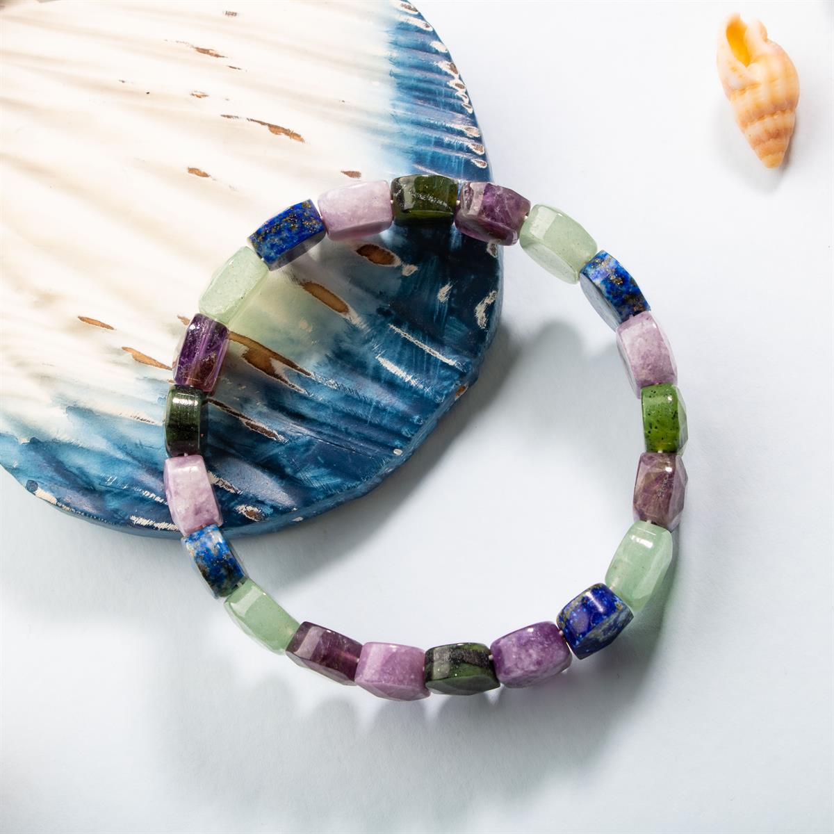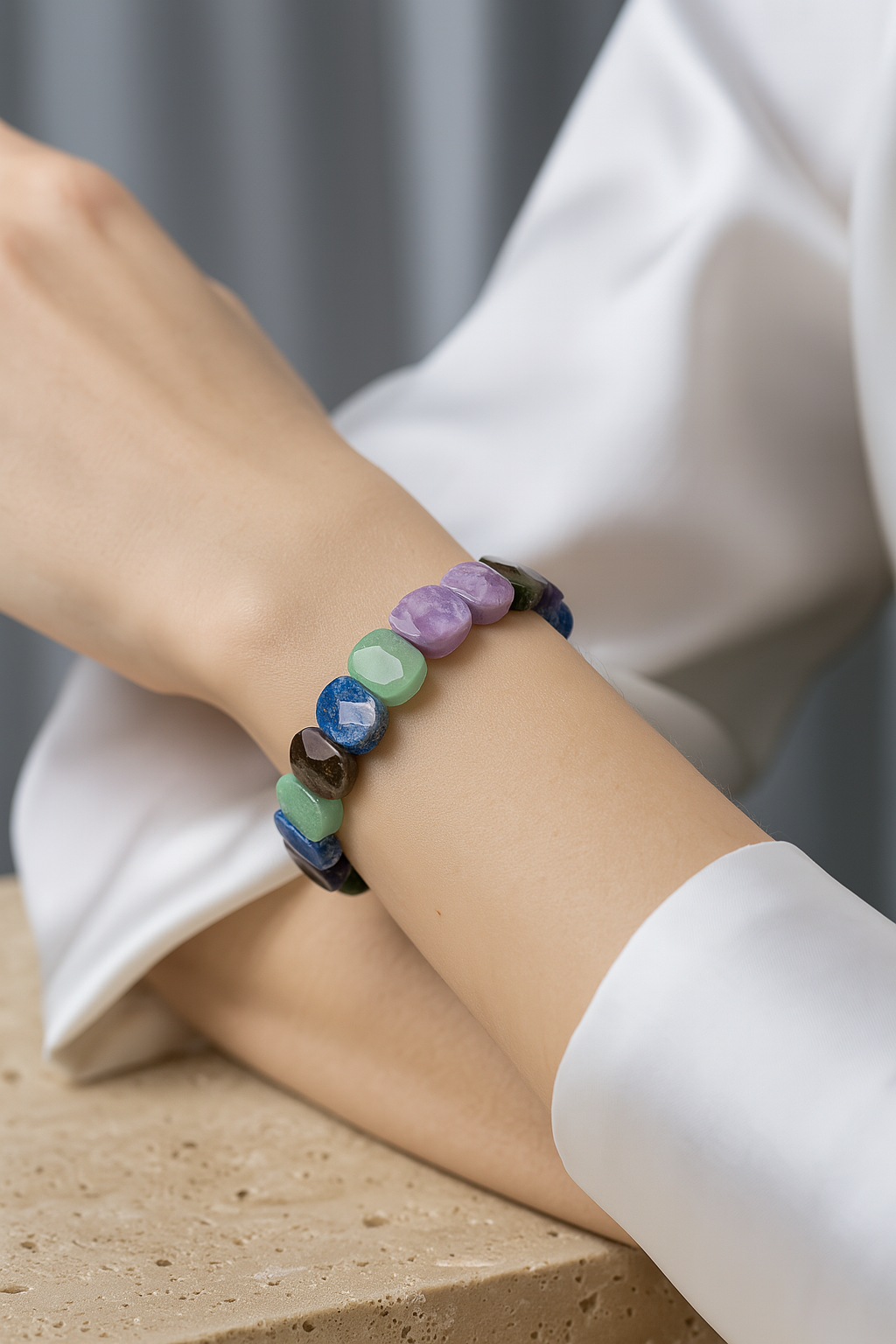 Yay burcunun bağımsız ve enerjik ruhuna özel olarak hazırlanan bu bileklik, ametist, aventurin, lapis lazuli ve lepidolittaşlarının geniş kesimli doğal formlarıyla tasarlandı. Her taş, Yay burcunun karakteristik özellikleriyle uyumlu olarak seçilmiş ve bir araya getirilmiştir. Geniş formu sayesinde hem güçlü bir duruş hem de zarif bir stil sunar.
