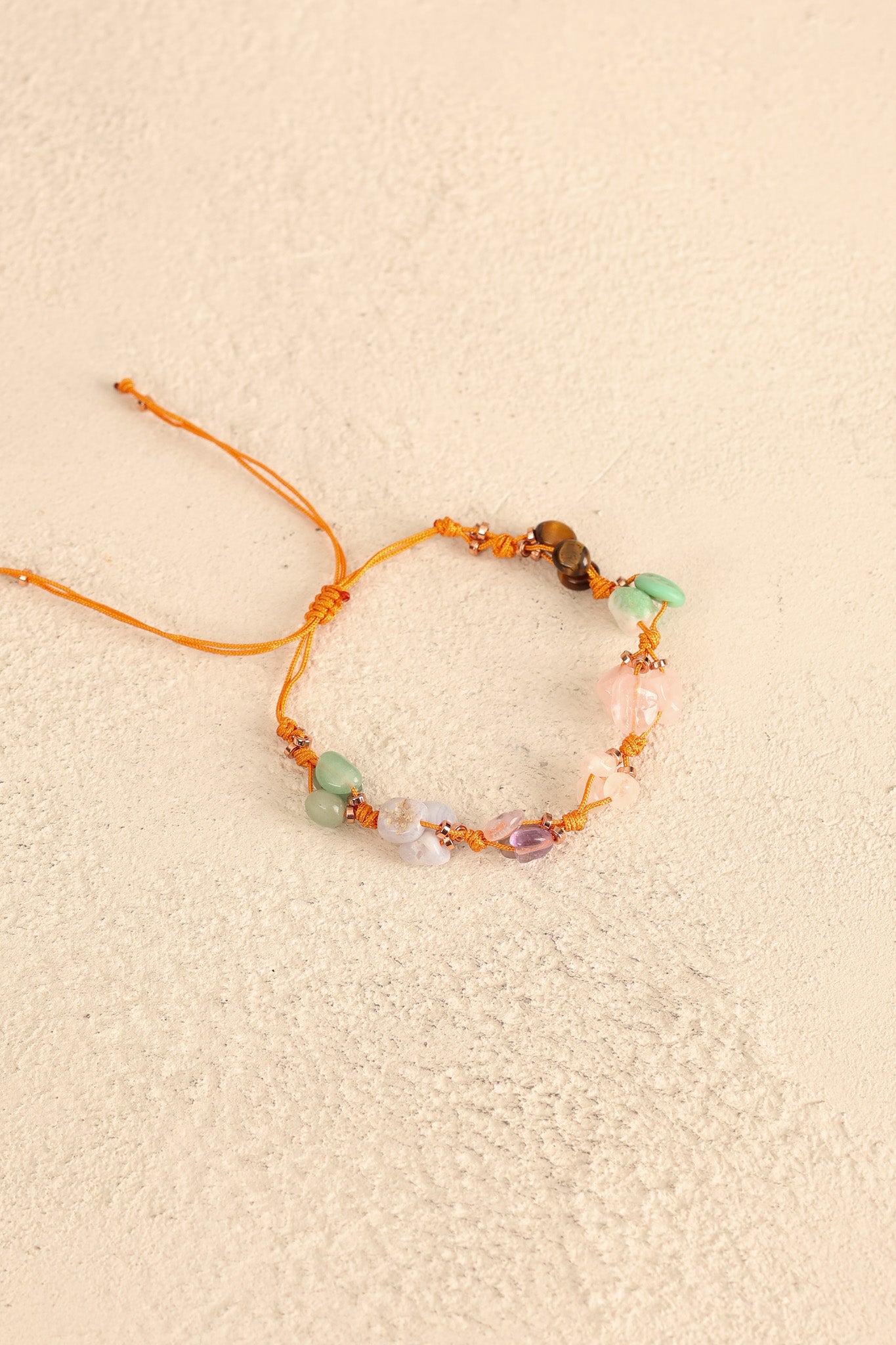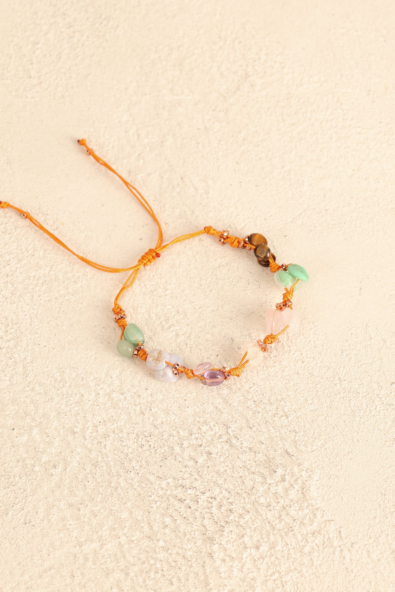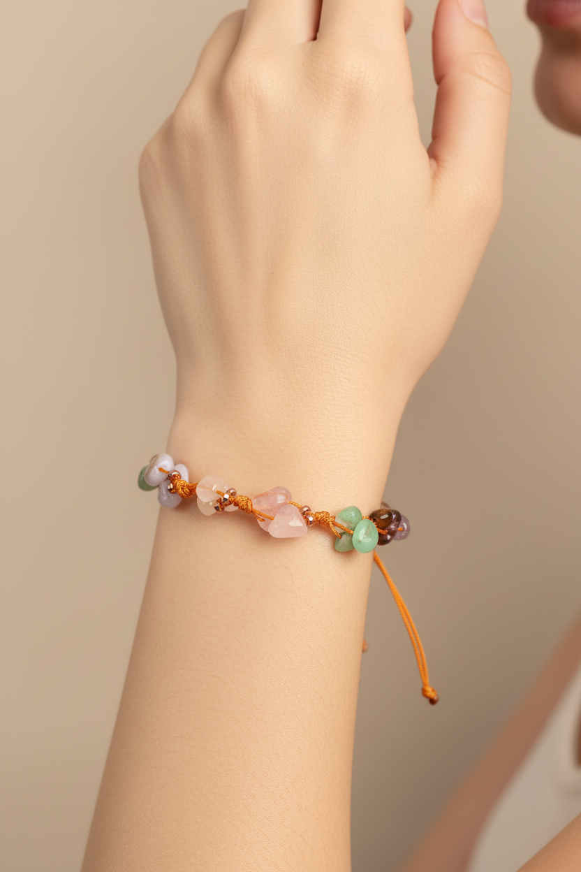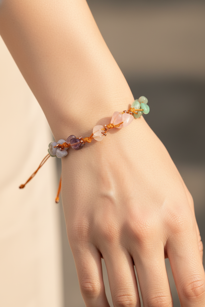 Bu bileklikte kullanılan taşlar, Yengeç burcunun koruma içgüdüsünü, sezgiselliğini ve duygusal dengesini yansıtır. Pastel ve doğal tonlardaki taşlar, hem zarif hem de huzur veren bir görünüm sunar.