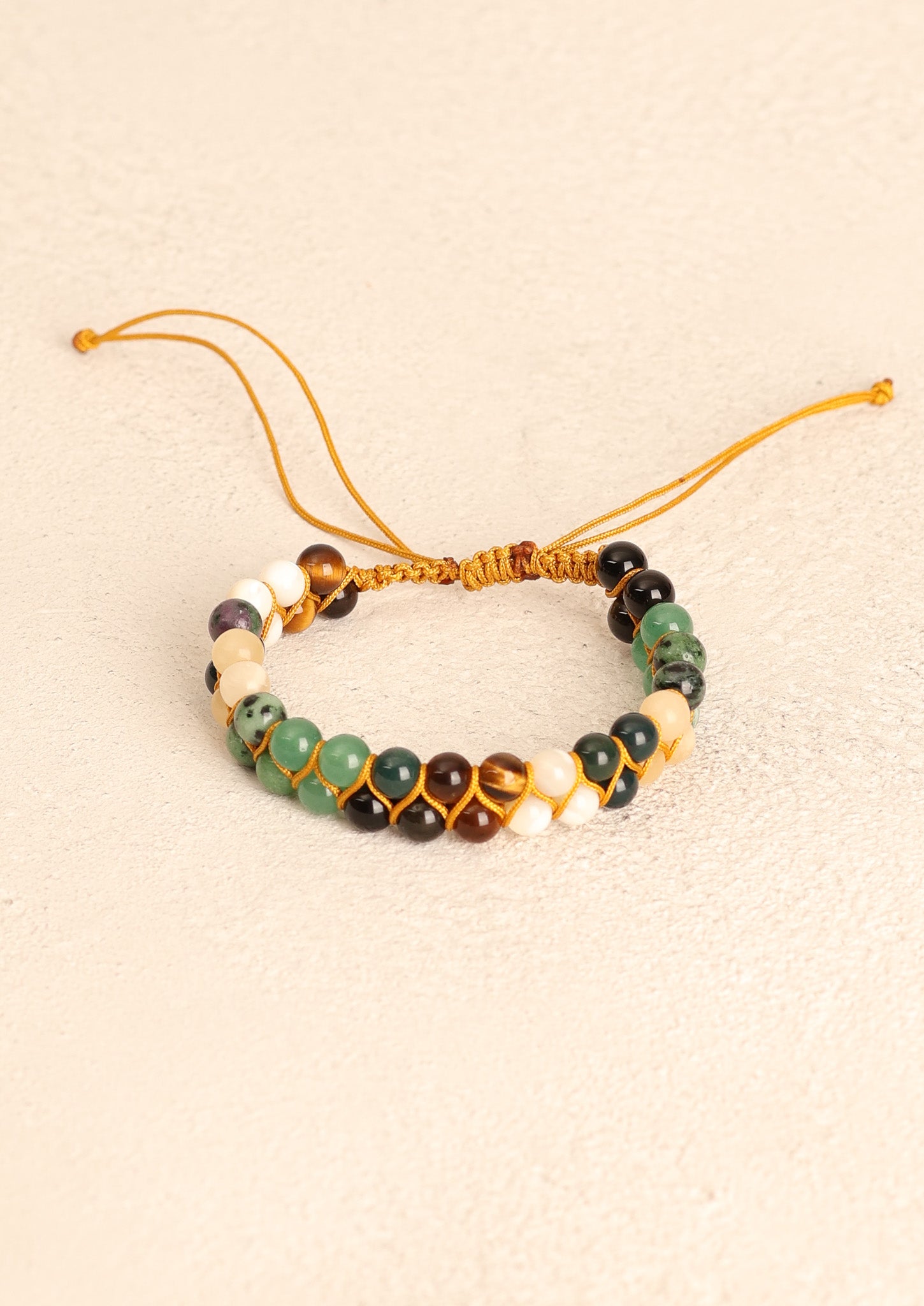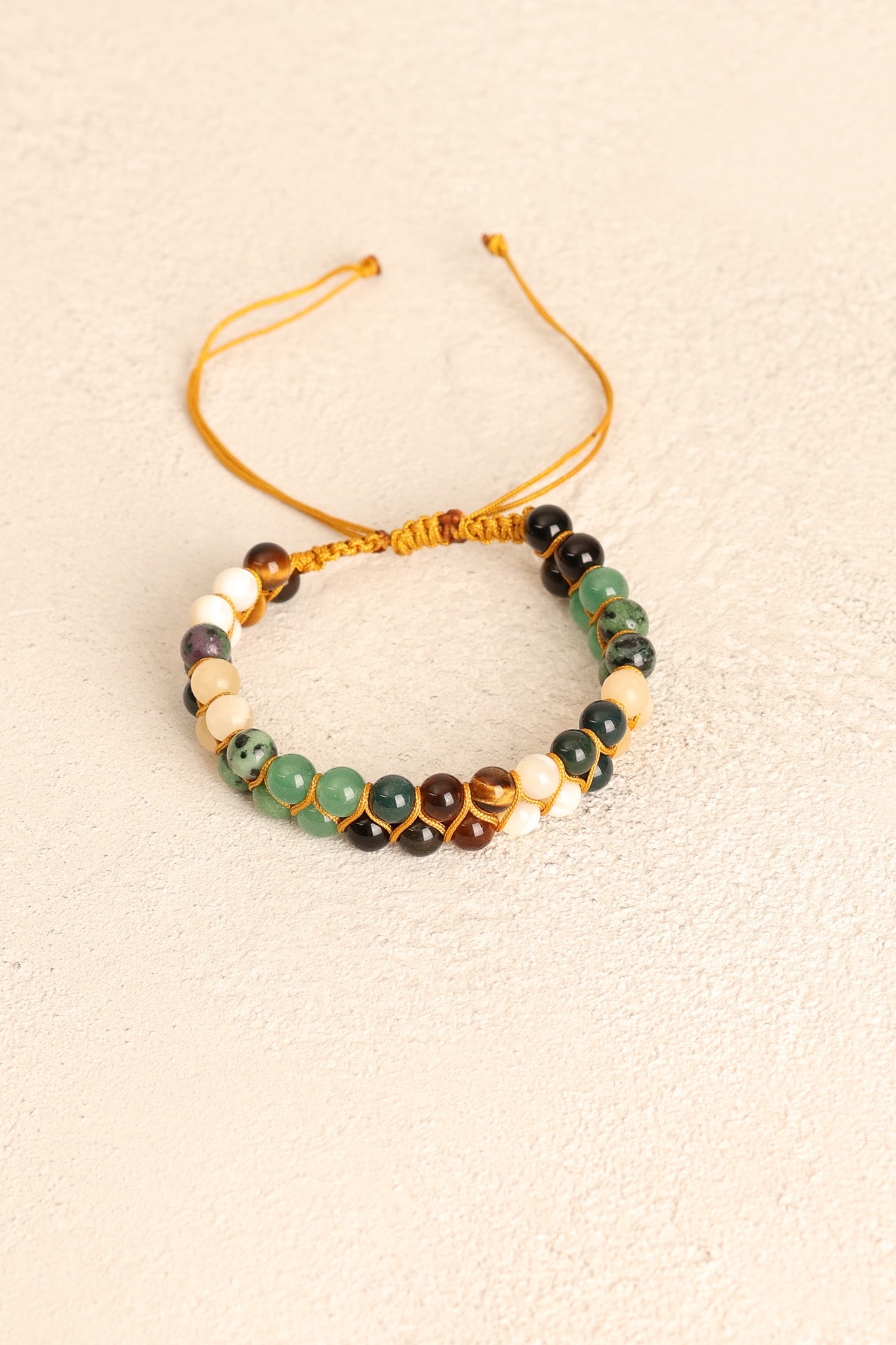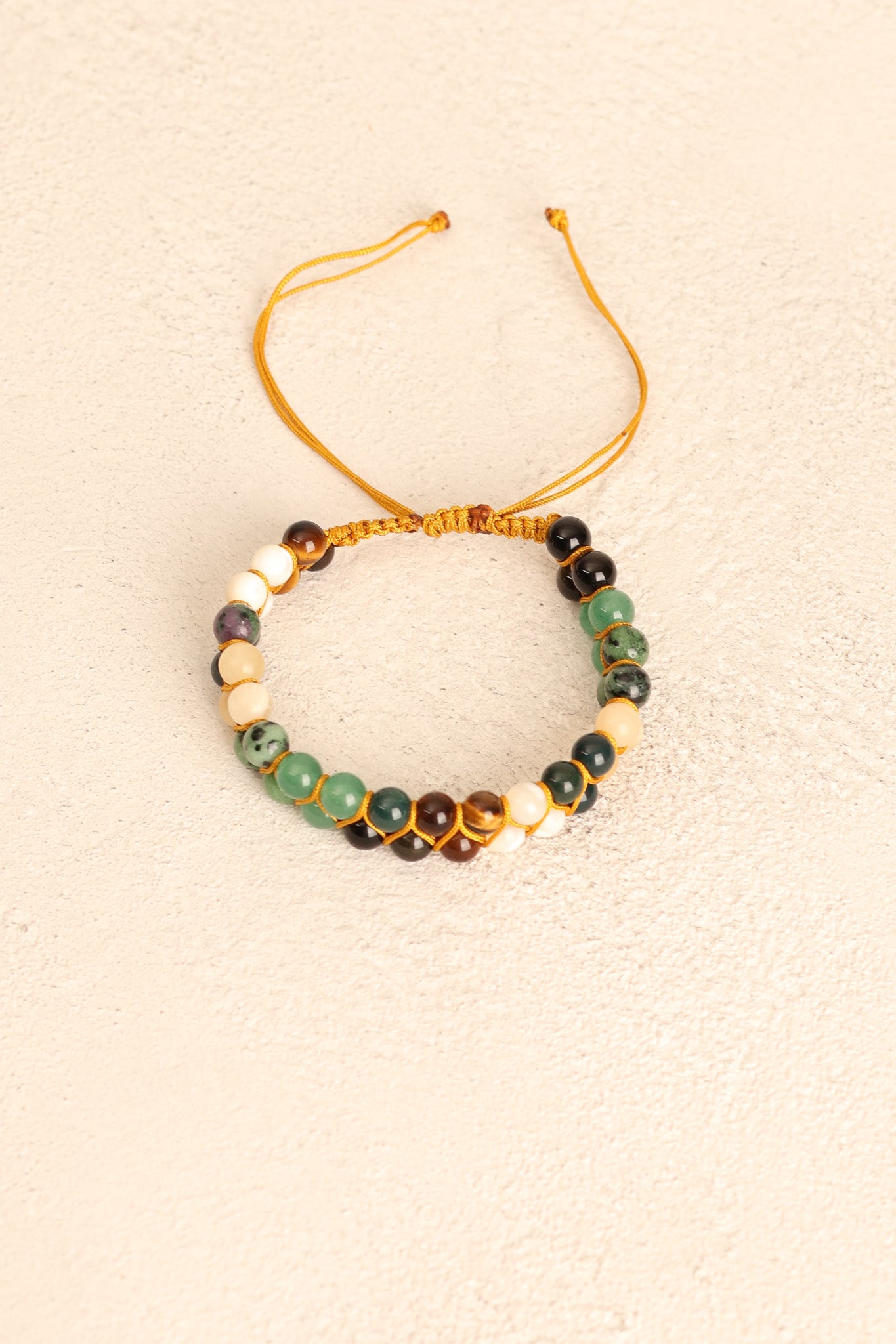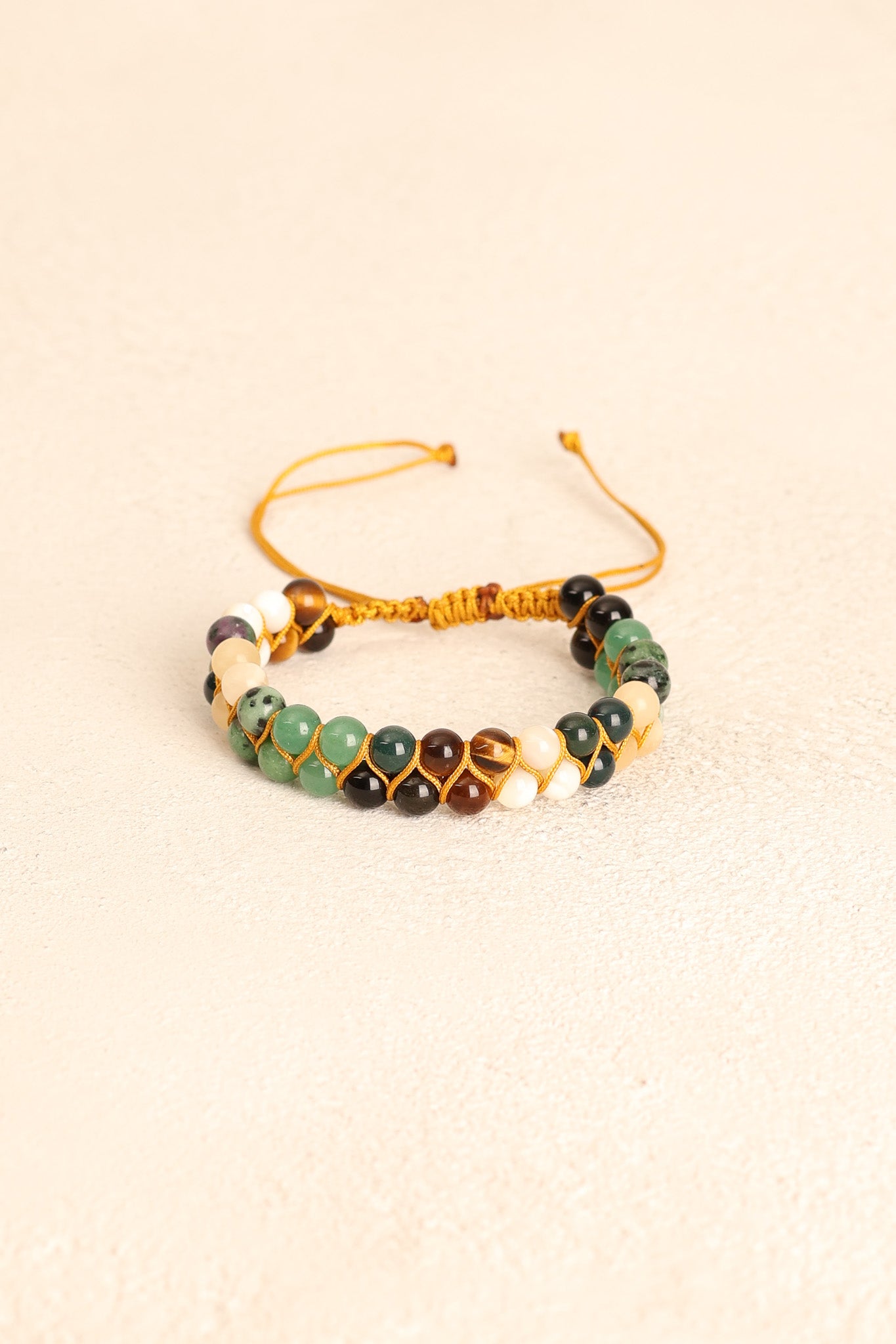 El işçiliğiyle örülmüş makrome bağlama tekniği, bilekliğe hem dayanıklılık hem de şık bir görünüm kazandırır.