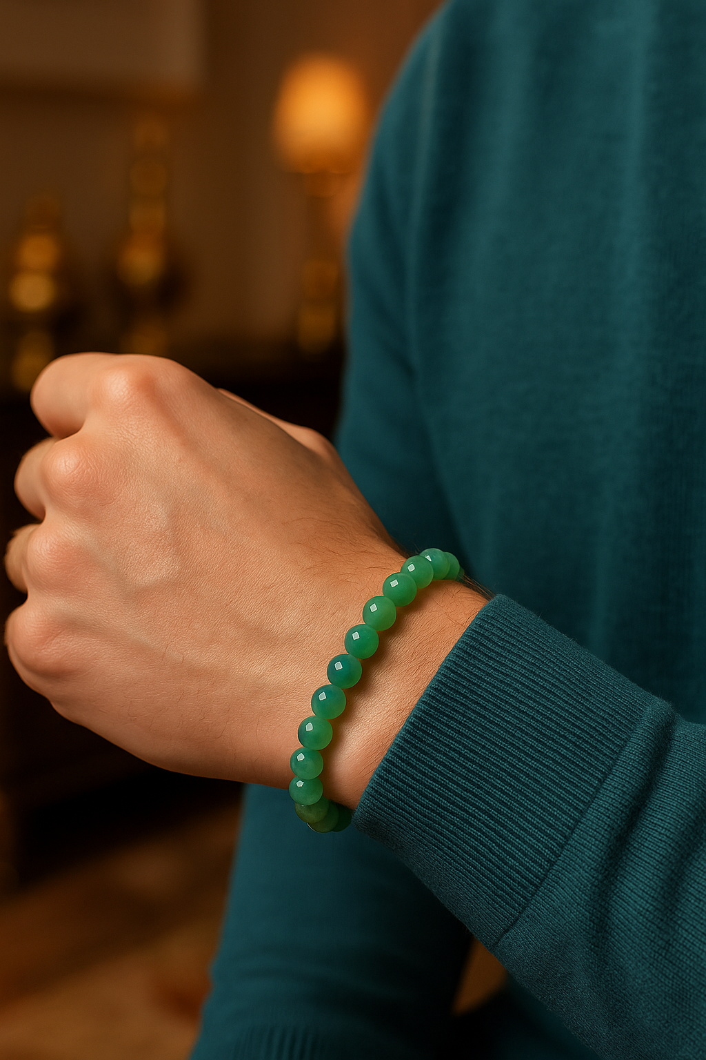 Doğanın en saf yeşil tonlarını taşıyan bu özel bileklik, 8 mm çapında küre kesim doğal yeşil akik taşlarından üretilmiştir. Taşların yarı saydam yapısı ve içinde barındırdığı özgün damarlar, her bilekliğe benzersiz bir karakter kazandırır.