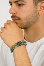 Yarı saydam yapısı ve yumuşak yeşil tonlarıyla bilinen yeşil florit taşı, bu özel bileklikte 8 mm yuvarlak kesim formuyla hazırlanmış ve çift sıra el yapımı makrome örgü ile tamamlanmıştır. Dengeli dizilimi ve doğal ışıltısıyla bilekte sade ama etkileyici bir duruş sunar.