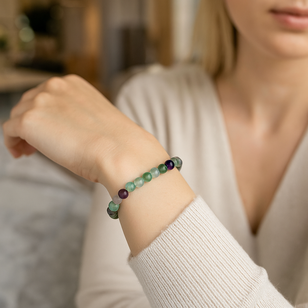 Yeşil florit taşları, doğadan gelen serin tonları ve saydam yapısıyla her bilekliği eşsiz kılar. Günlük kullanımda zarif, huzurlu ve ferah bir aksesuar arayanlar için idealdir. Minimal stilin güçlü temsilcilerindendir.