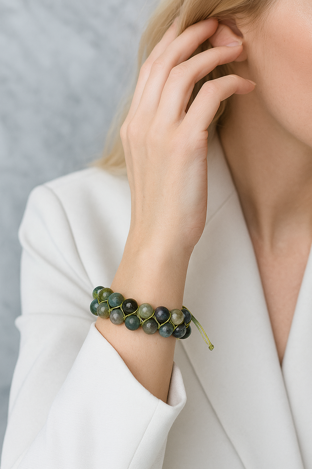 Yeşilin sayısız tonunu yarı saydam açık zeminle buluşturan ve içerisinde doğal yosun görünümlü desenler taşıyan yosun akik taşı, bu özel bileklikte 8 mm doğal taşlarla çift sıra dizilmiş ve ayarlanabilir makrome örgü tekniğiyle tamamlanmıştır. Taşların her biri doğada eşsiz bir iz gibi, bilekte benzersiz ve doğayla bütünleşen bir stil sunar.