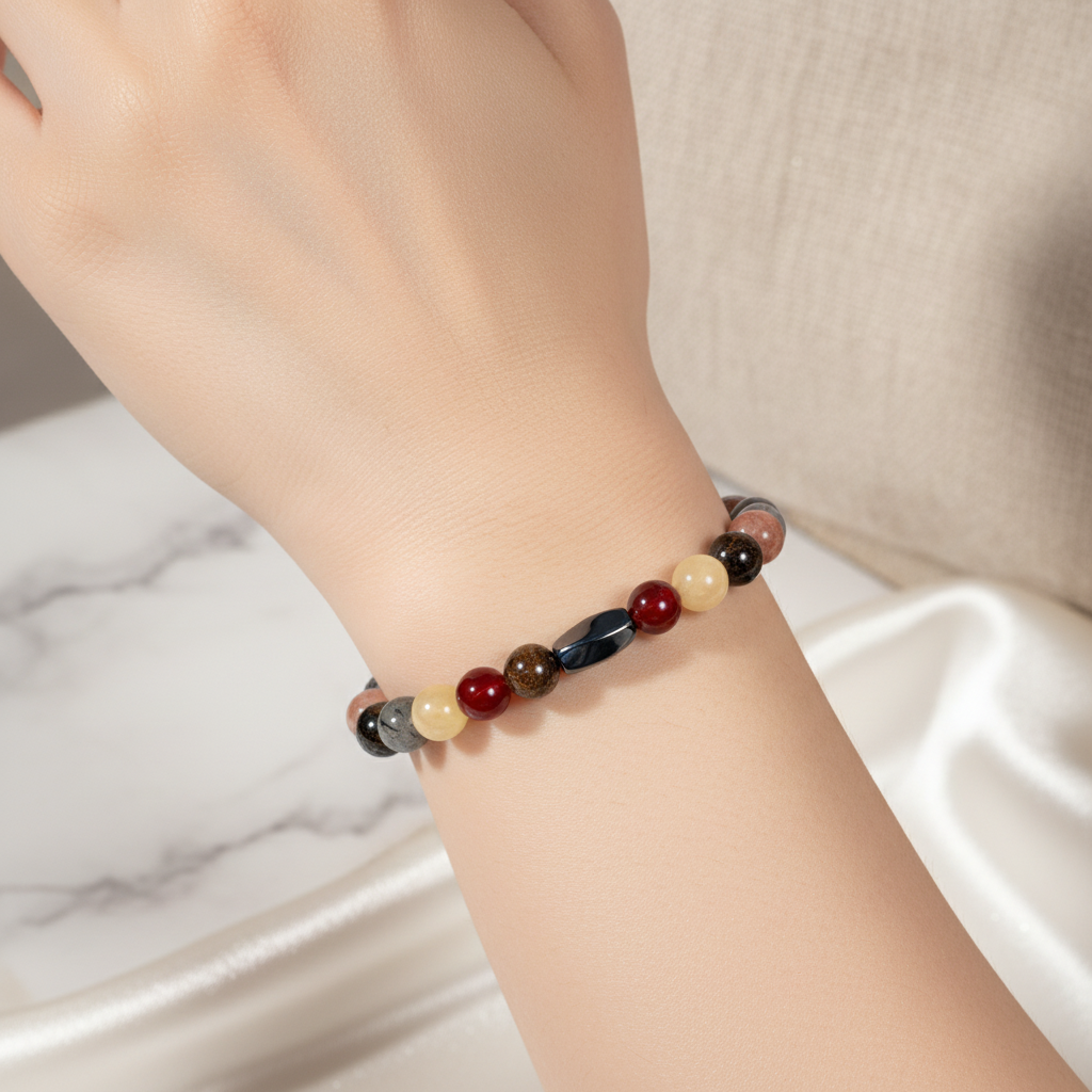 Aslan Burcu Doğal Taş Bileklik, Aslan burcu için özel olarak seçilmiş güçlü doğal taşların birleşimiyle hazırlanmıştır. Bordo granat lal, bronzit, golden obsidyen, güneş taşı, jasper, kalsit, kırmızı akik, labradorit, rutilli kuvars ve sitrin taşlarının uyumu, bilekte dikkat çekici ve estetik bir görünüm sunar. Günlük kullanım için konforlu ve modern bir tasarımdır.