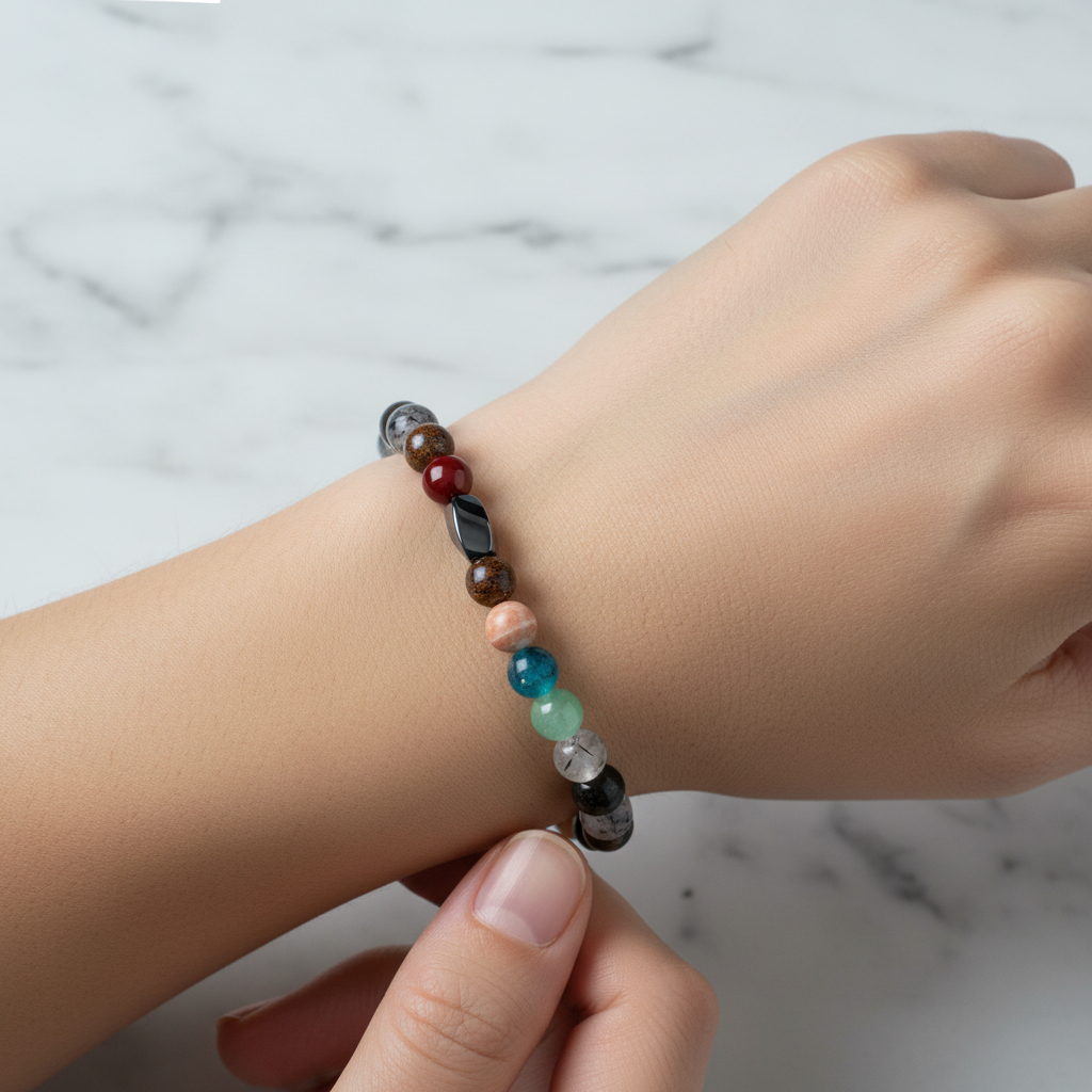 Boğa Burcu Doğal Taş Bileklik – Bronzit, Obsidyen, Güneş Taşı, Kalsit, Kristal Kuvars, Krizokol, Mavi Apatit, Rutilli Kuvars, Aventurin & Yeşim