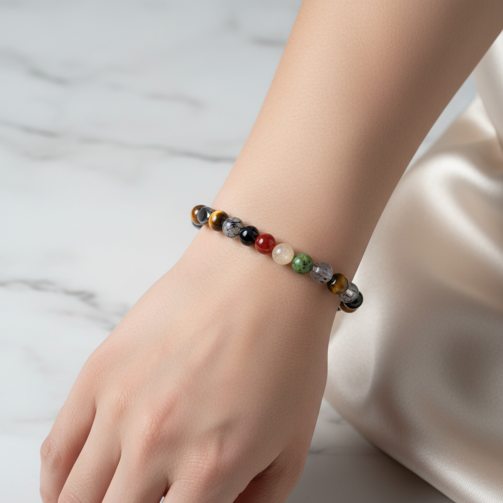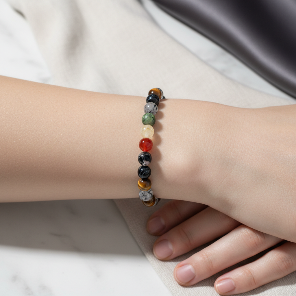İkizler Burcu Doğal Taş Bileklik – Güneş Taşı, Kaplan Gözü, Kırmızı Akik, Kristal Kuvars, Rutilli Kuvars, Sitrin & Yeşim