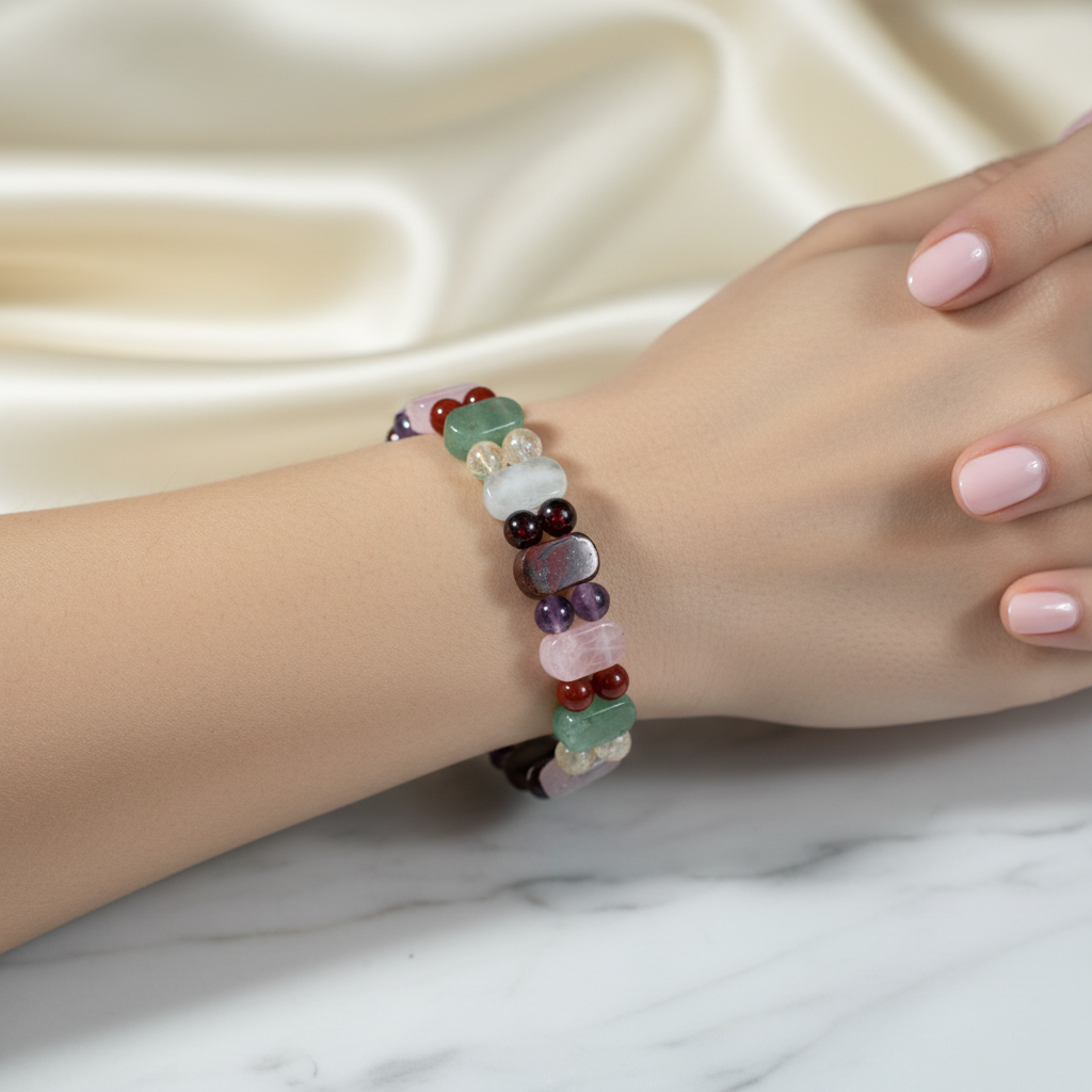 Koç Burcu Doğal Taş Bileklik, Koç burcu için özel olarak seçilmiş doğal taşların birleşimiyle hazırlanmış zarif bir aksesuardır. Akuamarin, ametist, bordo granat lal, jasper, kırmızı akik, pembe kuvars, sitrin ve yeşil aventurin taşlarının dengeli uyumu, bilekte estetik ve modern bir görünüm sunar. Günlük kullanım için konforlu ve şık bir seçenektir.
