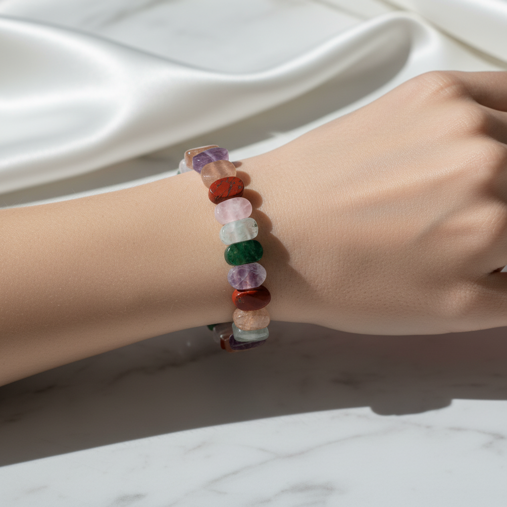 Koç Burcu Doğal Taş Bileklik, Koç burcu için özel olarak seçilmiş doğal taşların zarif uyumuyla hazırlanmış şık bir aksesuardır. Akuamarin, ametist, güneş taşı, jasper, pembe kuvars ve yeşil aventurin taşlarının birleşimi, bilekte estetik ve modern bir görünüm sunar. Günlük kullanım için hafif ve konforlu yapısıyla hem kadınlar hem de erkekler için uygundur.