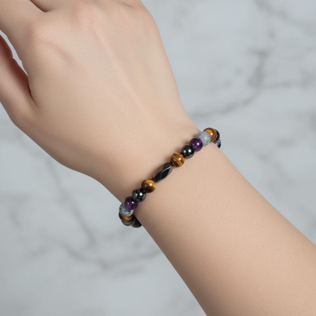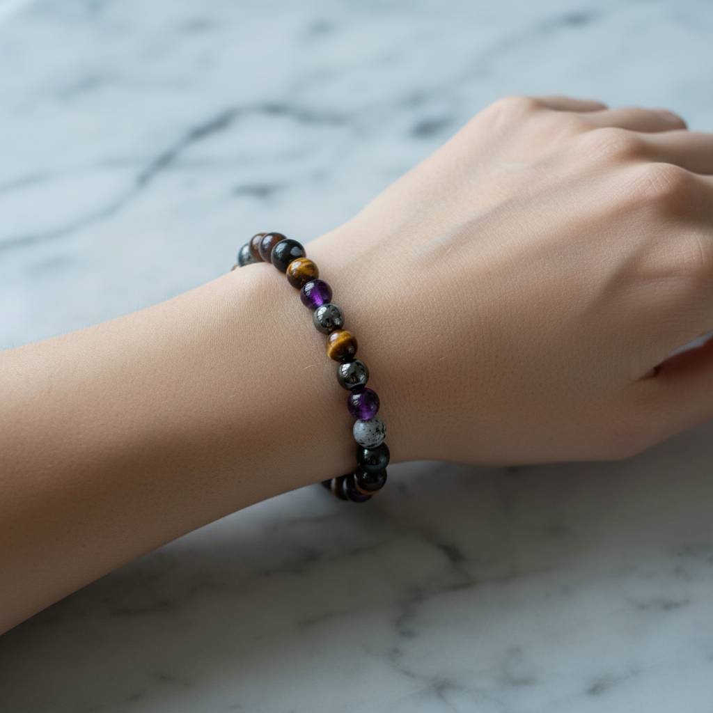 Kova Burcu Doğal Taş Bileklik – Ametist, Golden Obsidyen, İspanyol Varisit & Kaplan Gözü