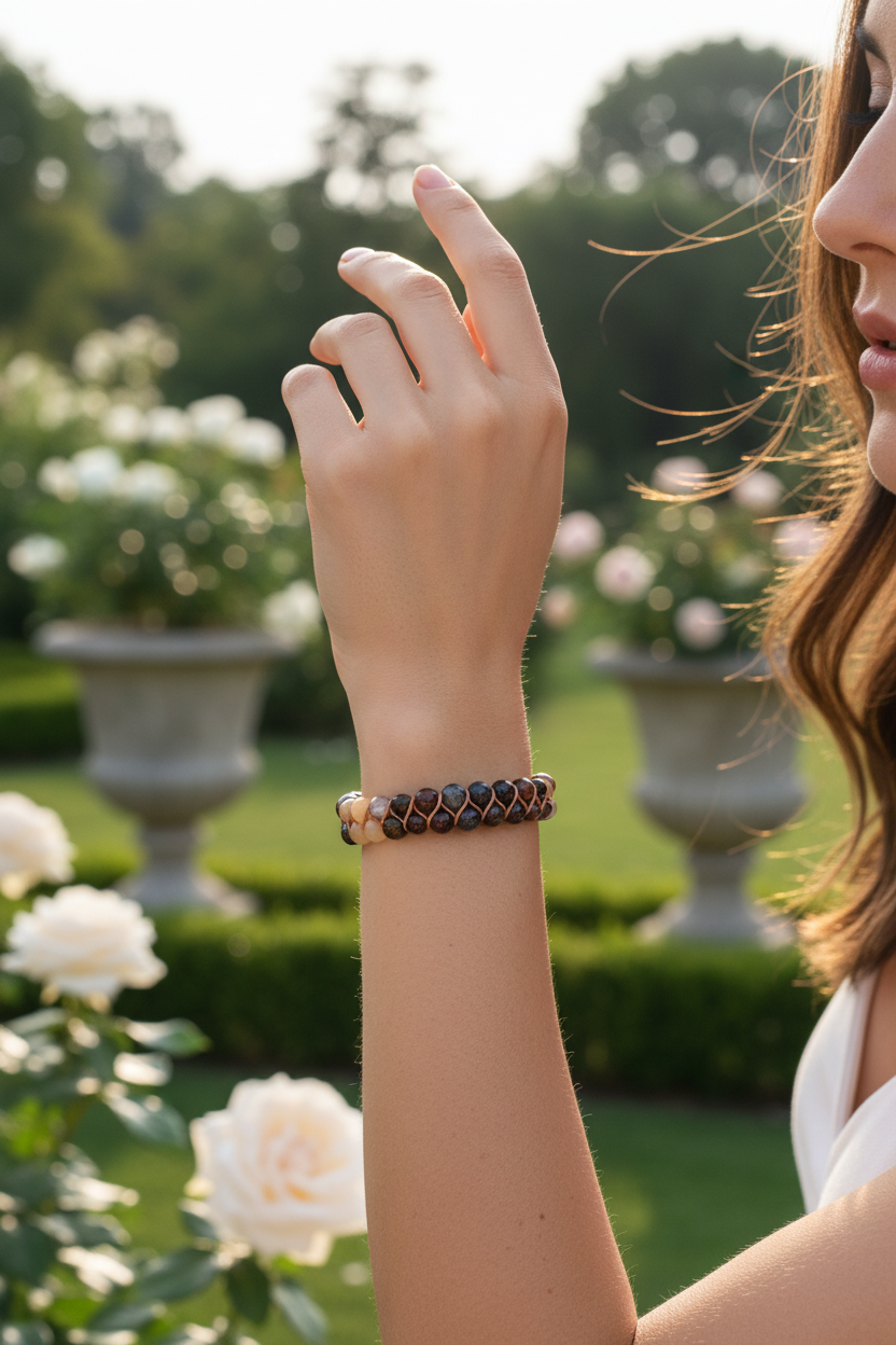 Çift sıra dizilim ve el işçiliğiyle örülmüş makrome tasarım, bilekliğe hem sağlamlık hem de göz alıcı bir görünüm kazandırır.
