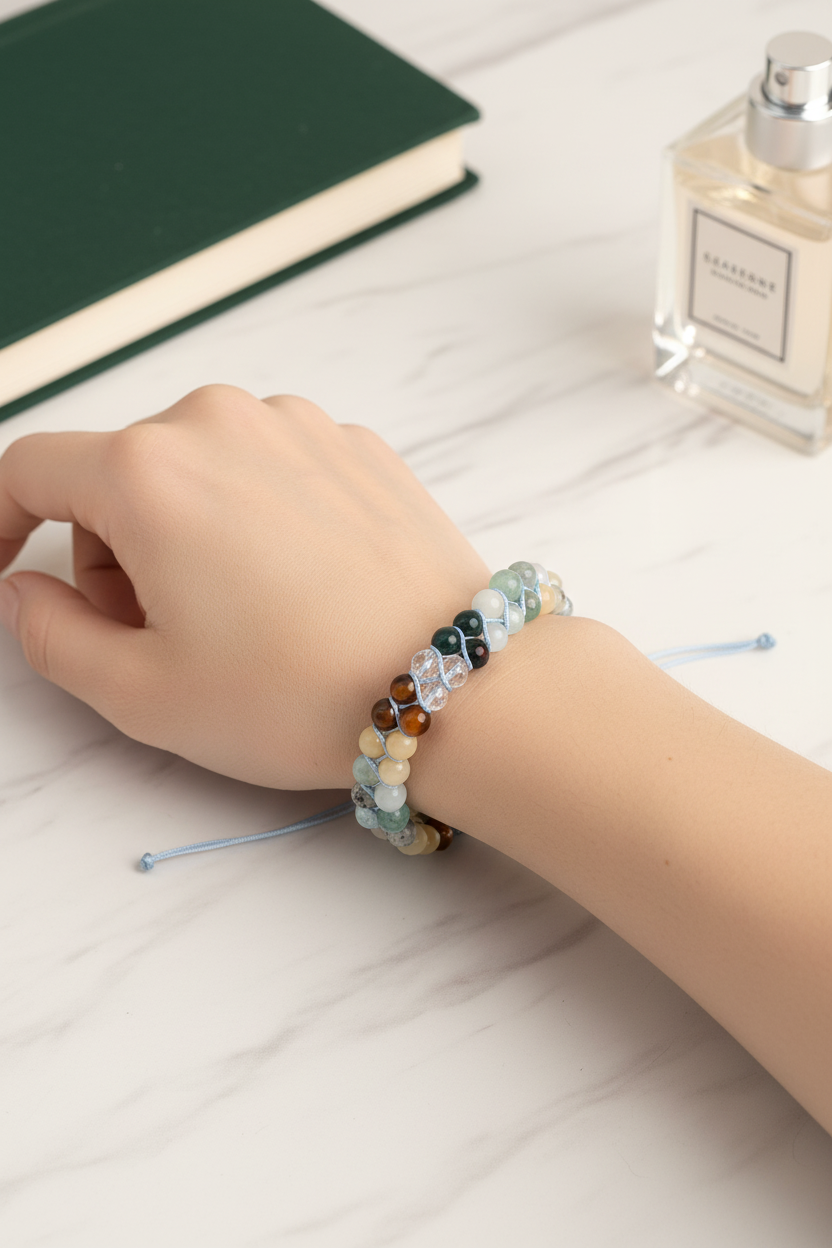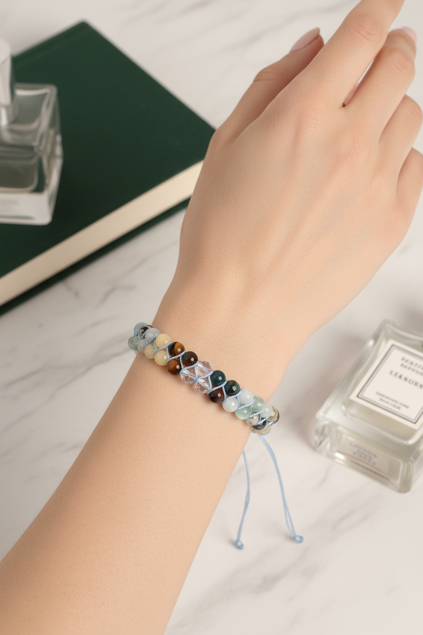 Duygusal derinliği, sezgileri ve zarif ruhuyla bilinen Balık burcuna özel olarak tasarlanan bu bileklik, burcun enerjisine uyumlu seçilmiş 7 farklı doğal taşın çift sıra dizilimiyle hazırlanmıştır.