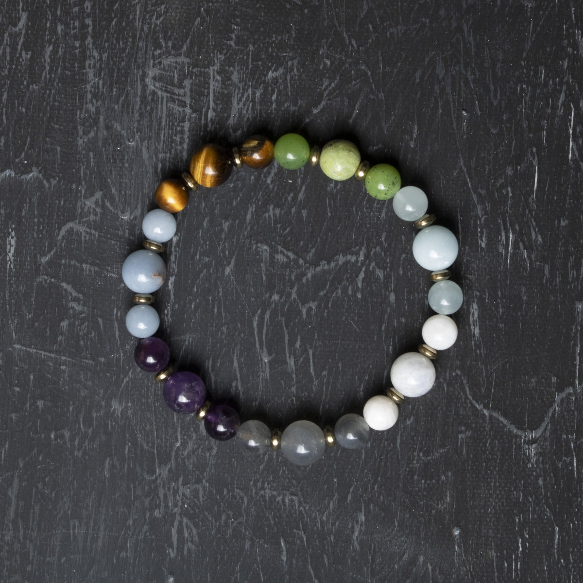 Kova burcuna özel seçilmiş altı farklı doğal taş, bilekliğe güçlü bir karakter ve estetik bir uyum kazandırır.