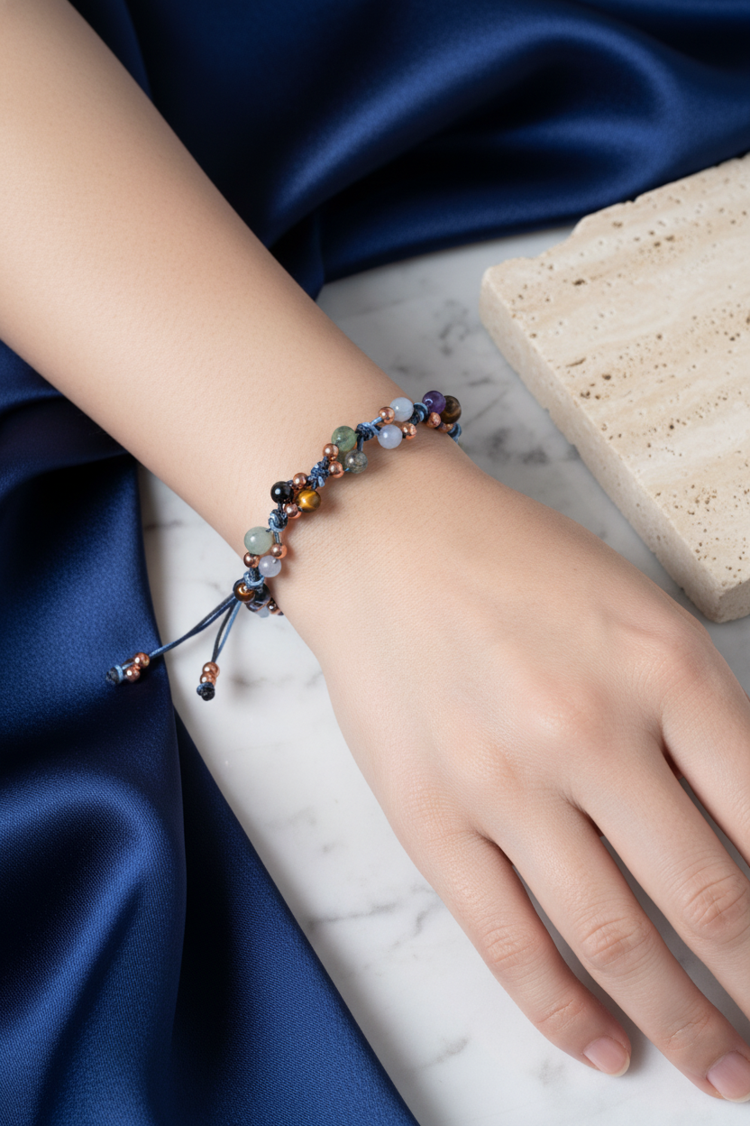 El işçiliğiyle örülmüş makrome bağlama tekniği, bilekliğe hem zarif bir görünüm hem de sağlam bir kullanım sunar.