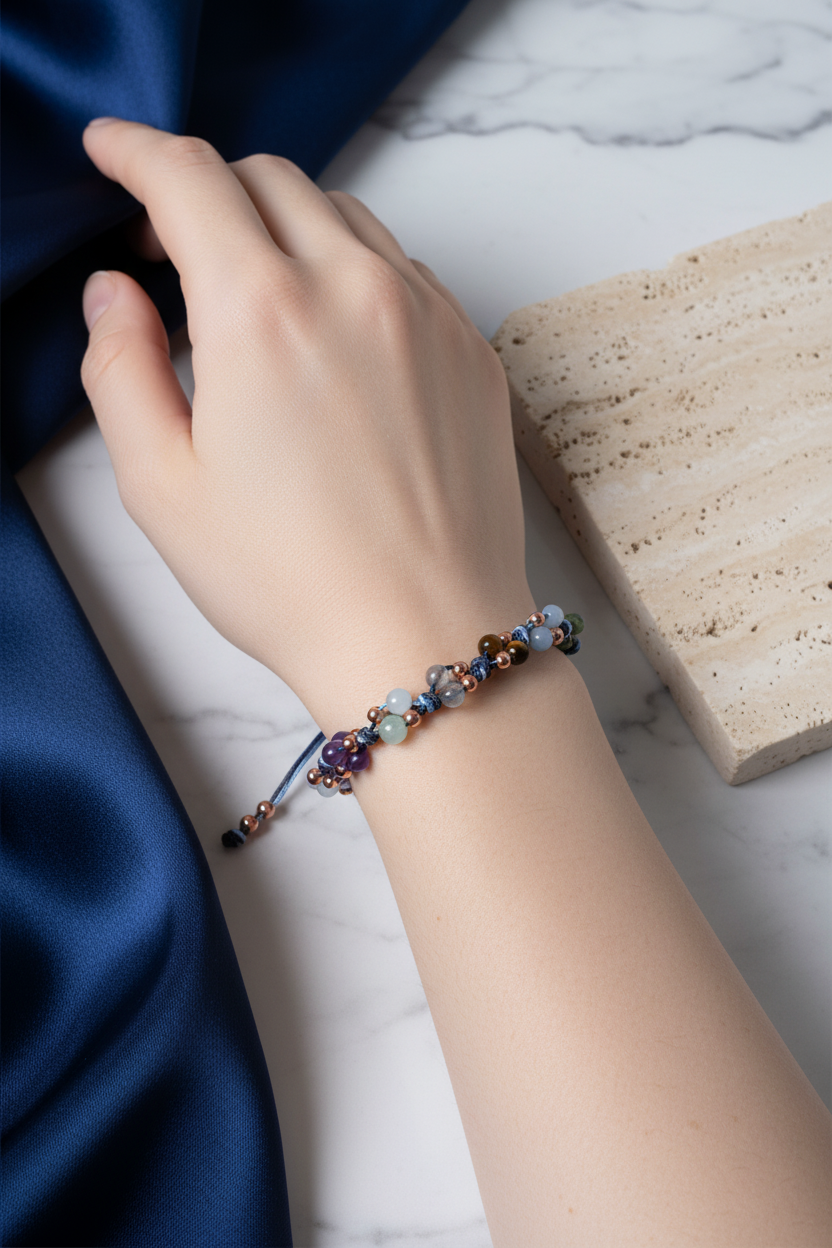 Kova burcuna özel olarak tasarlanan bu bileklik, burcun enerjisini destekleyen 8 farklı doğal taşın uyumlu kombinasyonu ile hazırlanmıştır.