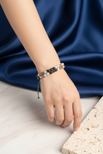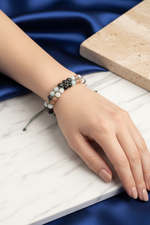 El işçiliğiyle örülmüş makrome bağlama tekniği, bilekliğe hem sağlamlık hem de sofistike bir görünüm kazandırır.