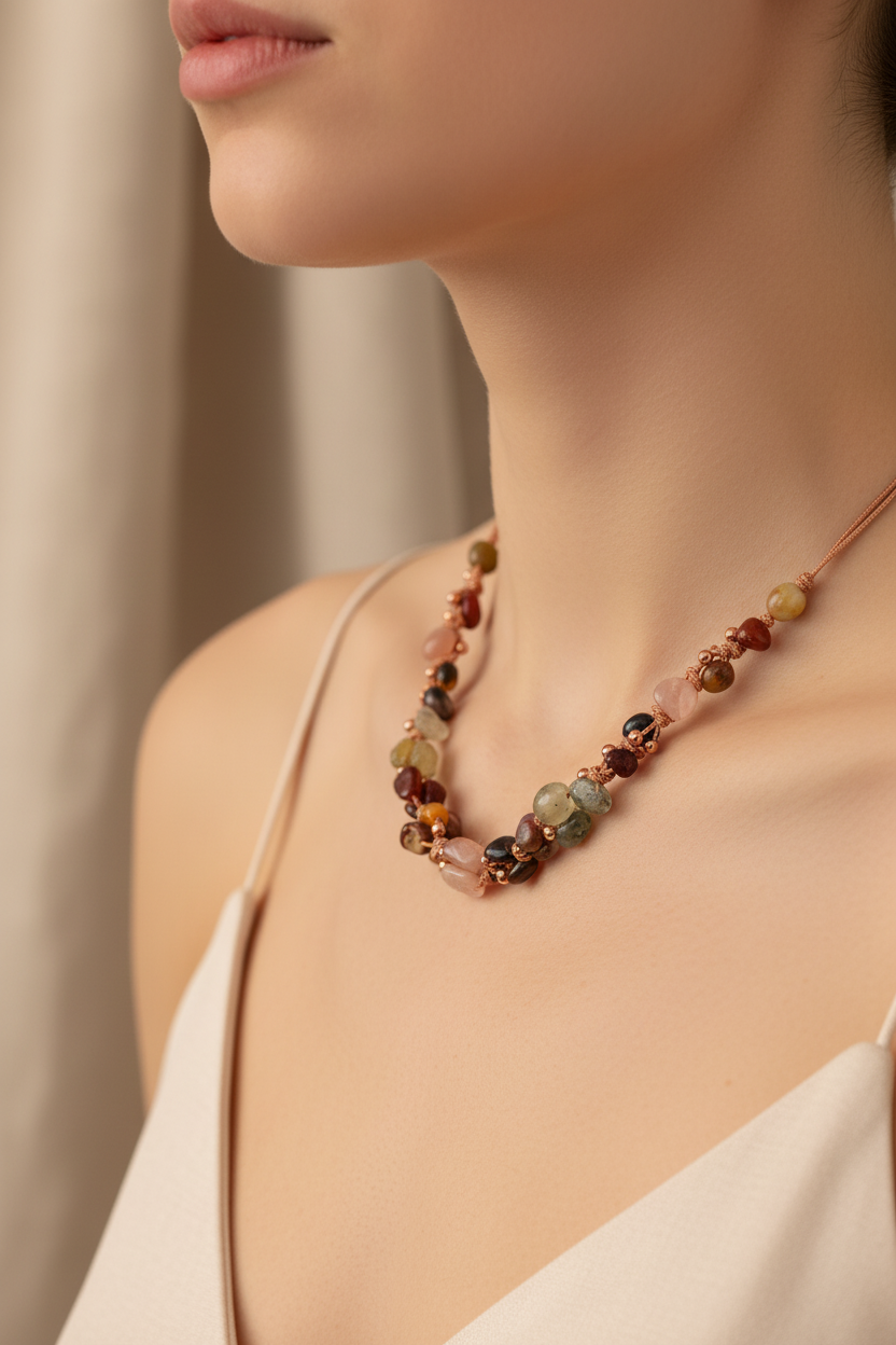 Her taşın kendine özgü damar yapısı, rengi ve kristal dokusu sayesinde her kolye benzersizdir.