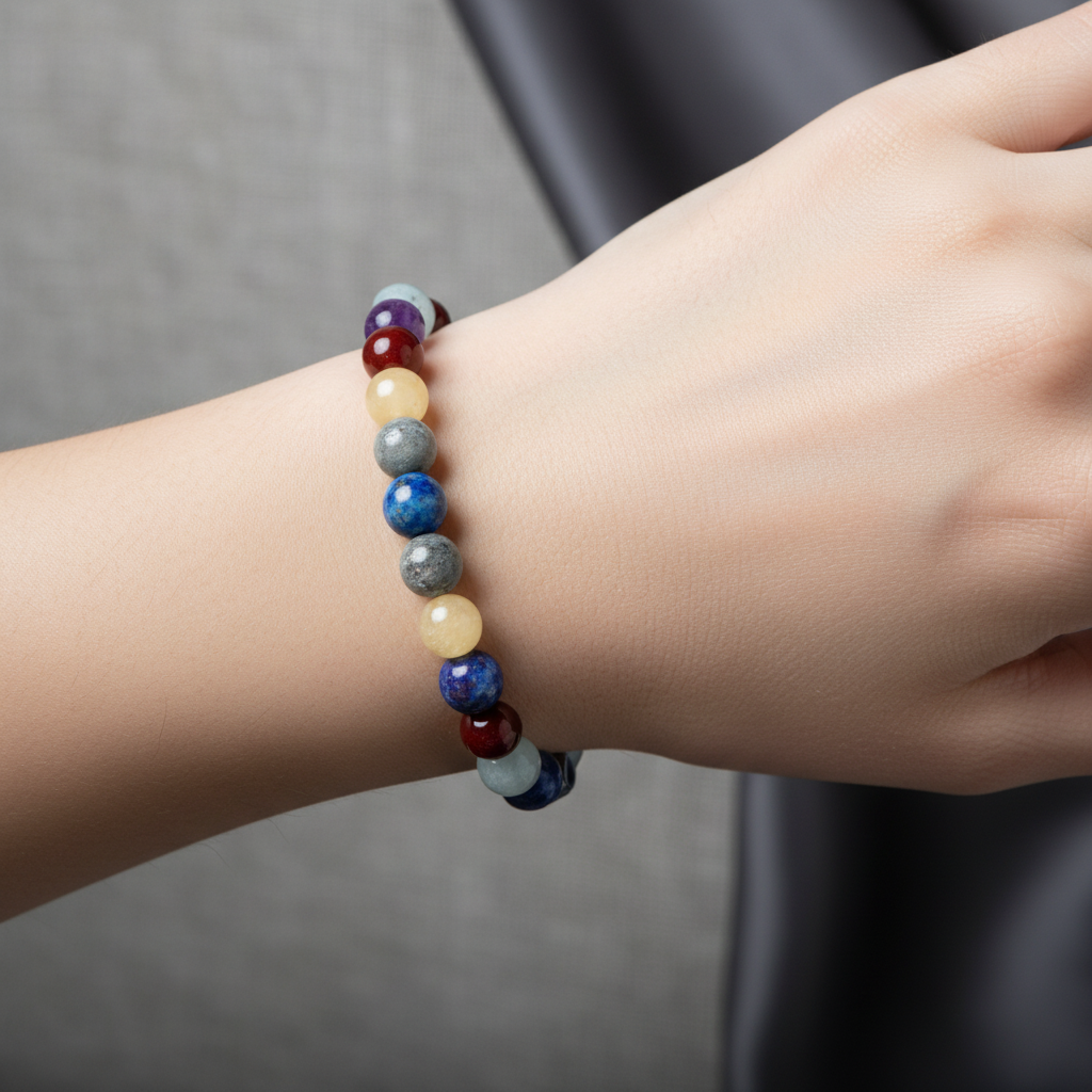 Yay Burcu Doğal Taş Bileklik, Yay burcu için özel olarak seçilmiş doğal taşların zarif uyumuyla hazırlanmış şık bir aksesuardır. Akuamarin, ametist, kalsit, kırmızı akik, labradorit ve lapis lazuli taşlarının birleşimi bilekte estetik ve dikkat çekici bir görünüm sunar. Günlük kullanım için hafif, konforlu ve modern bir tasarımdır.