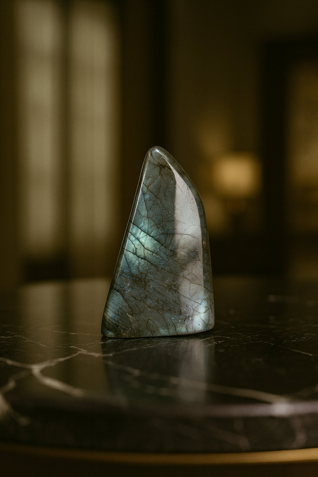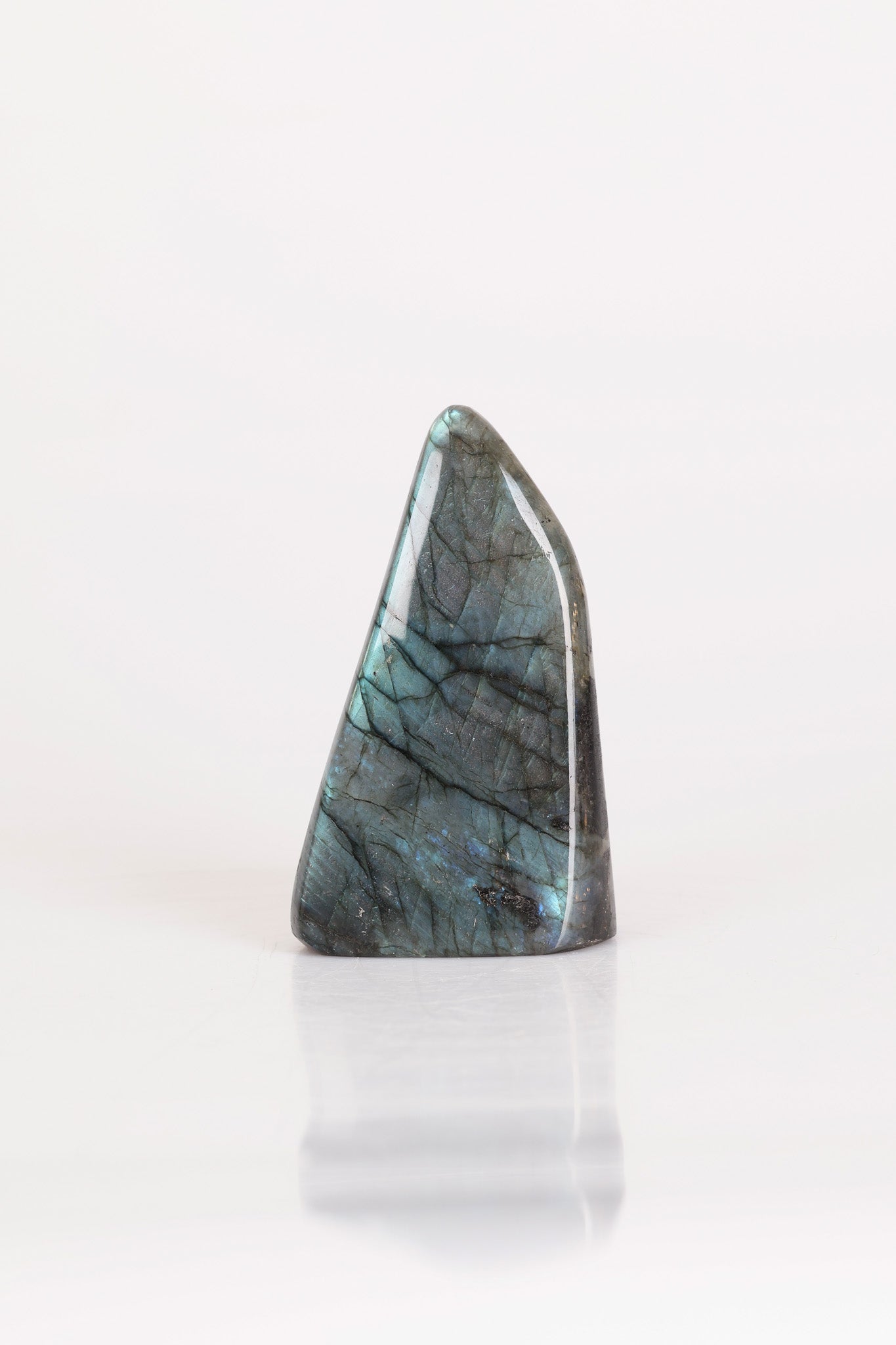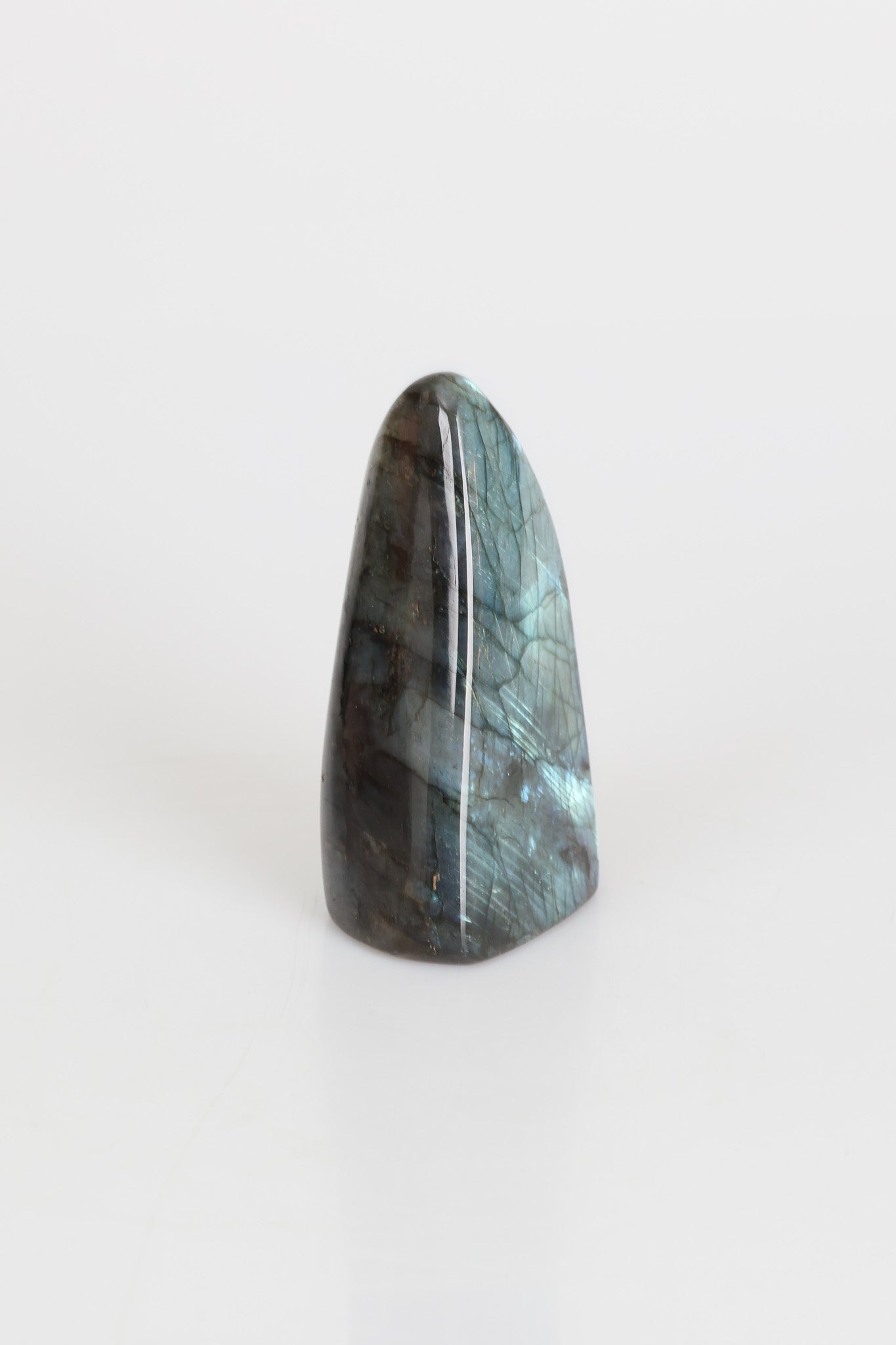406 gram ağırlığında, 11 cm yüksekliğinde ve 6 cm genişliğinde olan bu Labradorit doğal taş ham parça, mavi, yeşil ve gri tonlarının ışıkla buluştuğunda ortaya çıkardığı büyüleyici “labradoresans” yansımalarıyla öne çıkar. Yüksek ve zarif formu sayesinde sergilendiği ortamda dikkat çeken bir odak noktası oluşturur.