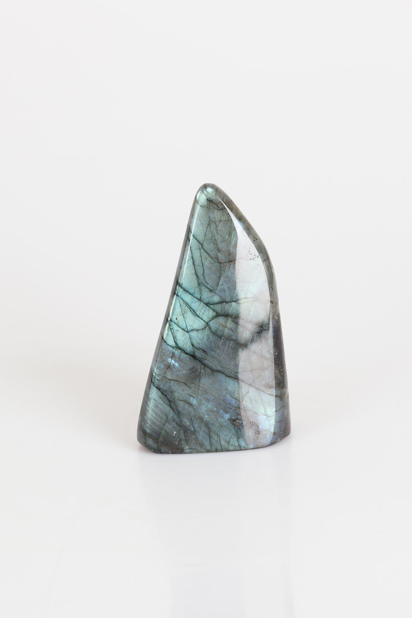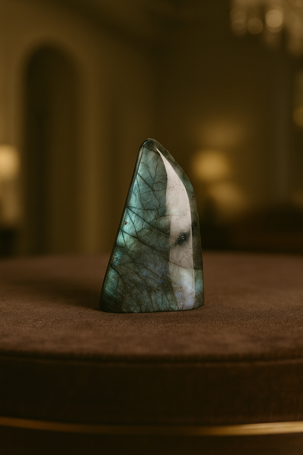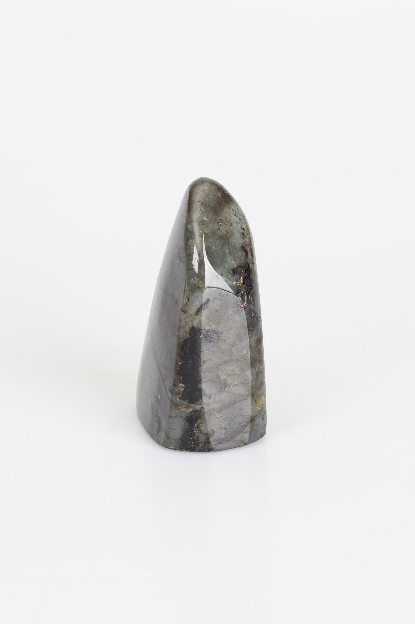 406 gram ağırlığında, 11 cm yüksekliğinde ve 6 cm genişliğinde olan bu Labradorit doğal taş ham parça, mavi, yeşil ve gri tonlarının ışıkla buluştuğunda ortaya çıkardığı büyüleyici “labradoresans” yansımalarıyla öne çıkar. Yüksek ve zarif formu sayesinde sergilendiği ortamda dikkat çeken bir odak noktası oluşturur.