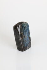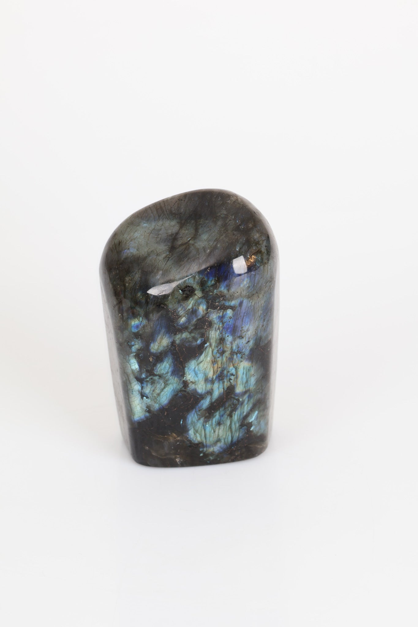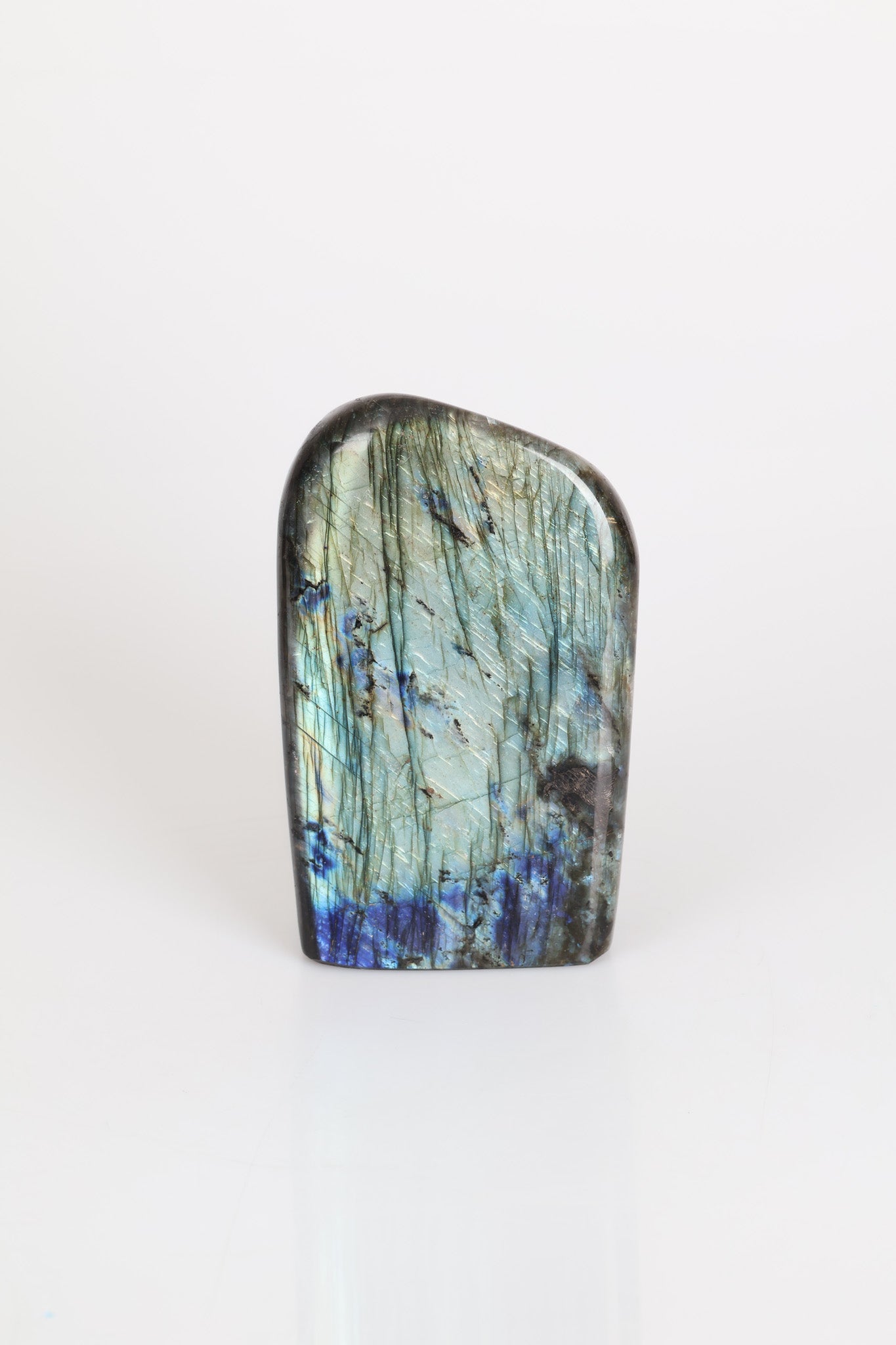 2,290 kg ağırlığında, 17 cm yüksekliğinde ve 10 cm genişliğinde olan bu Labradorit doğal taş ham parça, ışıkla buluştuğunda mavi, yeşil ve gri tonlarının büyüleyici “labradoresans” yansımalarını sergileyen nadir bir örnektir. Büyük boyutları sayesinde sergilendiği her ortamda güçlü bir odak noktası oluşturur.