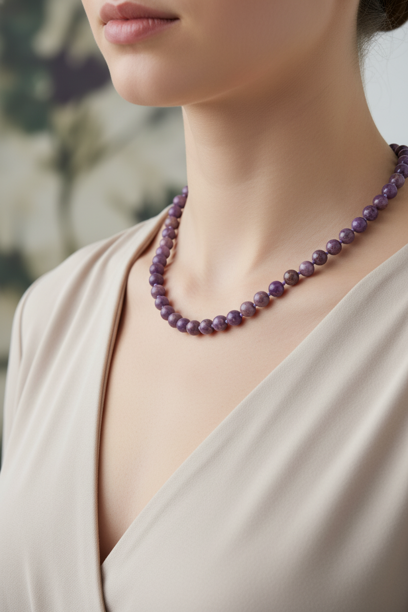 Fosfosideritin doğal mor tonlarıyla tasarlanan bu 8 mm düğümlü kolye, özenli el işçiliğiyle hazırlanmıştır. Boncuklar arasındaki düğüm detayları, hem estetik bir görünüm hem de uzun süreli kullanımda dayanıklılık sağlar. Günlük şıklığınızı tamamlayan zarif bir aksesuar olmasının yanı sıra, özel davetlerde de sofistike bir dokunuş sunar.