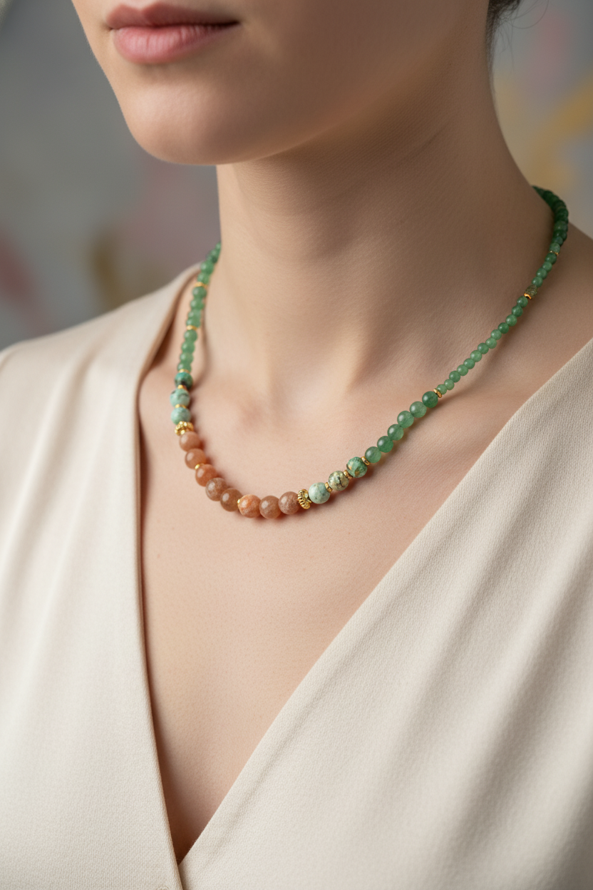 İspanyol varisitin doğal yeşil tonları, güneş taşının sıcak parıltısı ve yeşil aventurinin canlı dokusu altın kaplama detaylarla birleşerek zarif bir kolye tasarımına dönüşüyor. El işçiliğiyle hazırlanan bu özel parça; günlük kombinlere sofistike bir dokunuş katarken özel davetlerde de modern bir şıklık sunar. Doğal taşların estetik uyumunu zamansız bir tasarımla öne çıkarır.
