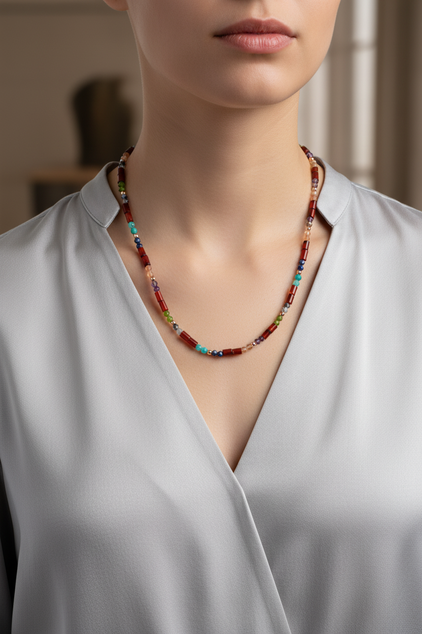 Altı farklı doğal taşın uyumu, el işçiliğiyle hazırlanmış bu özel kolyede modern bir tasarıma dönüşüyor. Kırmızı akik taşının sıcak tonları, ay taşının gizemli parlamaları, ametistin mor zarafeti, güneş taşının canlı ışıltısı, yeşimin doğal yeşil tonları ve amazonitin ferahlatıcı rengi bir araya gelerek göz alıcı bir bütünlük oluşturuyor. Günlük kombinlerde zarif bir dokunuş, özel günlerde ise sofistike bir tamamlayıcı sunar.