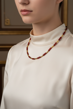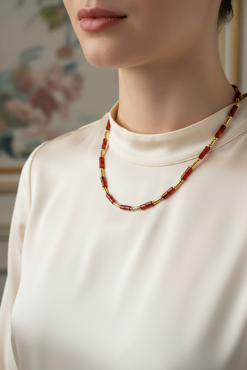 Kırmızı akik taşının sıcak ve derin tonları, hematitin modern metalik parlaklığıyla birleşerek şık bir kolye tasarımına dönüşüyor. El işçiliğiyle özenle hazırlanmış bu özel parça; günlük kombinlerde zarif bir tamamlayıcı, özel davetlerde ise sofistike bir aksesuar olarak öne çıkar. Dayanıklı yapısı ve zamansız tasarımıyla koleksiyonlarda ayrıcalıklı bir yere sahiptir.