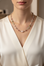 Labradoritin gizemli ışık oyunları, renkli turmalinin canlı tonları, güneş taşının sıcak ışıltısı ve pembe opalin yumuşak dokusu bir araya gelerek zarif bir kolye tasarımı oluşturuyor. El işçiliğiyle özenle hazırlanan bu özel parça; günlük kombinlerde modern bir şıklık, özel günlerde ise sofistike bir tamamlayıcı olarak öne çıkar. Doğal taşların kontrast uyumu tasarıma özgün bir karakter kazandırır.
