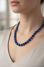 Lapis lazuli taşının asil lacivert rengini ve pirit ışıltılarını yansıtan bu 8 mm düğümlü kolye; koleksiyonuna modern, zarif ve dikkat çekici bir parça eklemek isteyenler için ideal seçimdir.