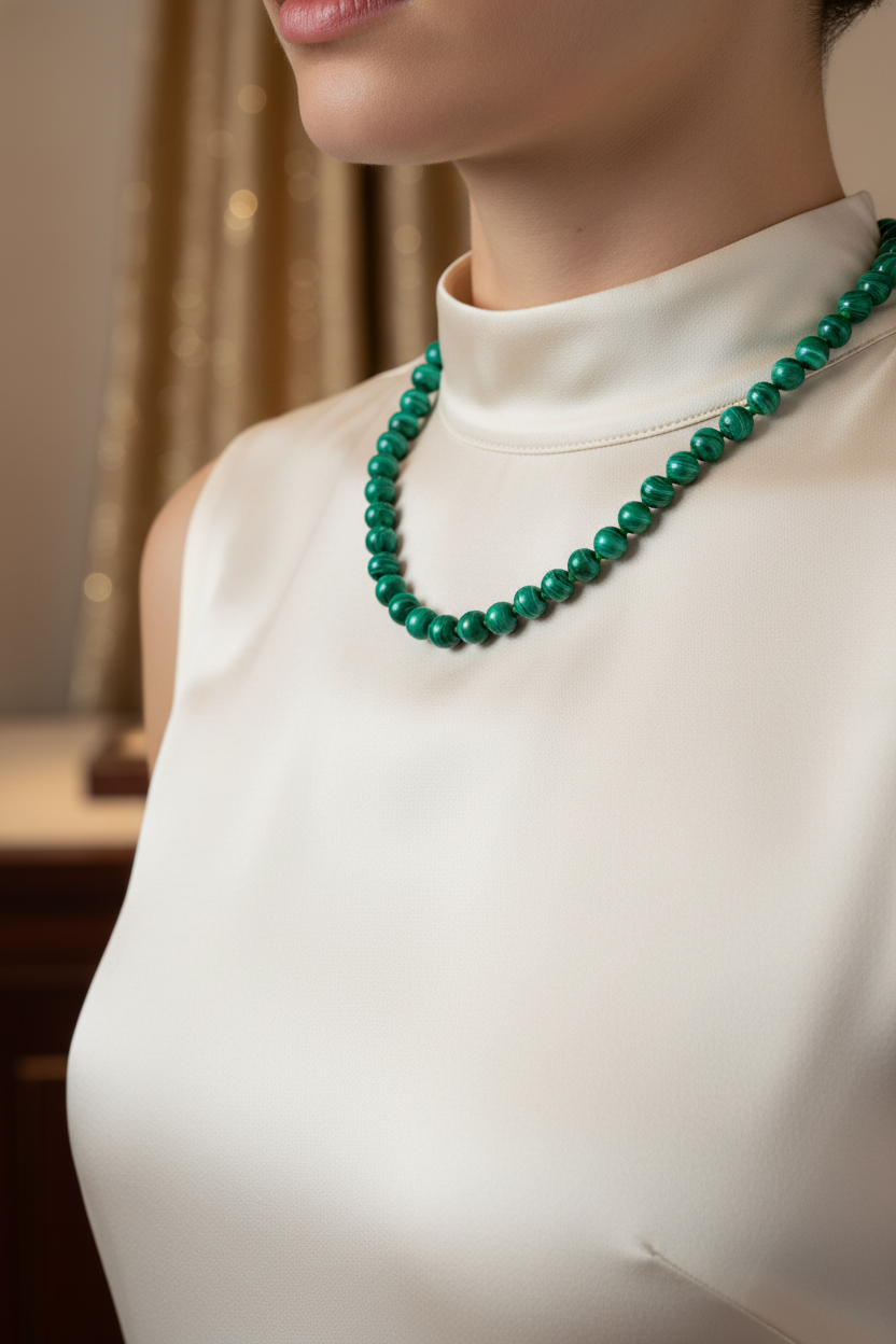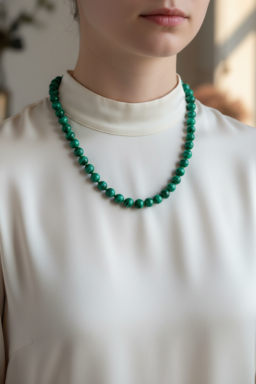 Malakit Doğal Taş Kolye – 8 mm Düğümlü, Unisex Tasarım