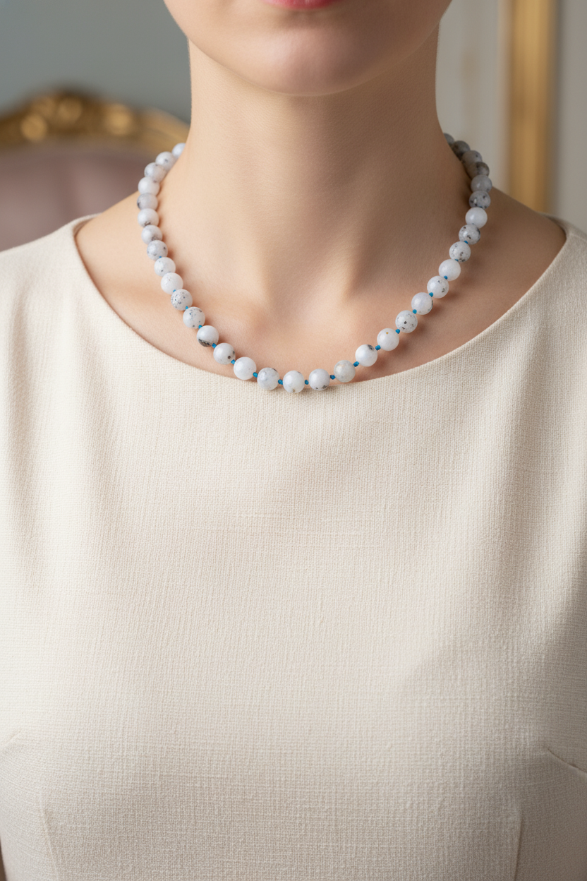 Mavi akik taşının zarif ve huzur verici tonları, 8 mm boyutunda tek tek düğümlenerek şık bir kolye formunda hazırlandı. Doğal taşın damar desenleri ve parlak yüzeyi ürüne sofistike bir karakter kazandırırken, düğümlü dizim tekniği taşların doğallığını ön plana çıkarır ve uzun ömürlü kullanım sağlar.