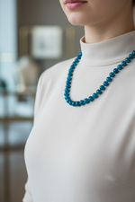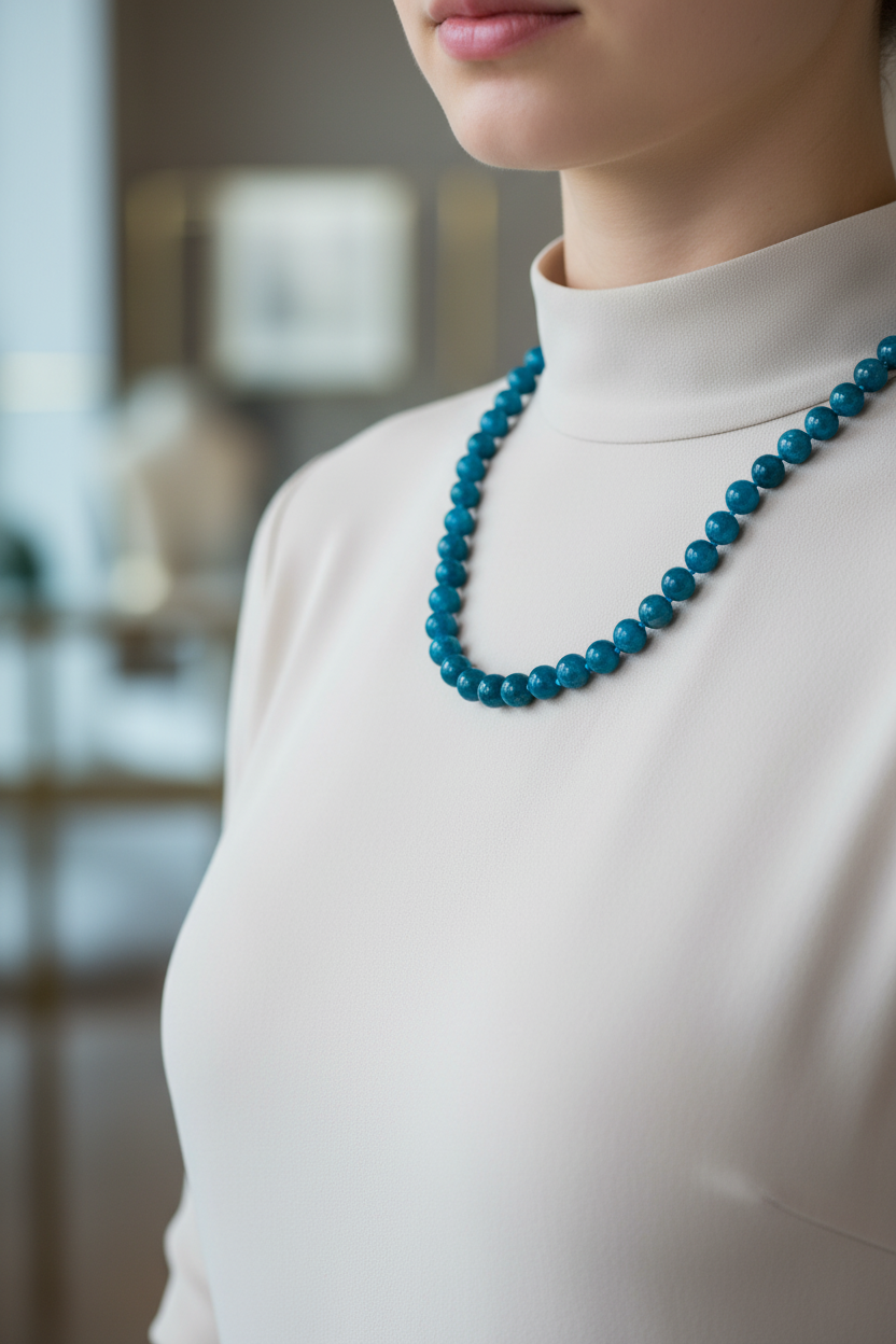 Mavi apatitin denizi andıran canlı tonlarını yansıtan bu 8 mm düğümlü kolye; koleksiyonuna modern, şık ve dikkat çekici bir parça eklemek isteyenler için ideal seçimdir.