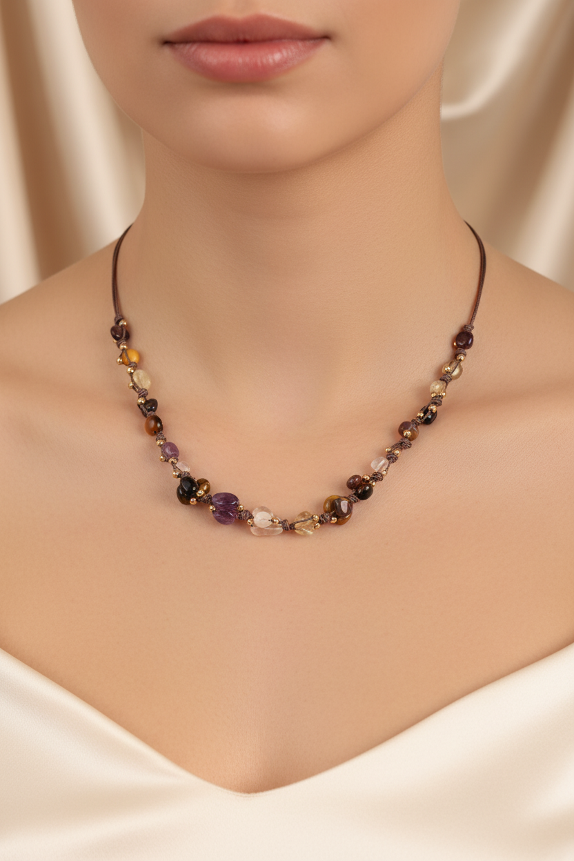 El işçiliğiyle hazırlanmış ayarlanabilir makrome örgü tasarım, farklı boyun ölçülerine kolayca uyum sağlar. Günlük kullanımda da özel anlarda da şık bir tamamlayıcıdır.