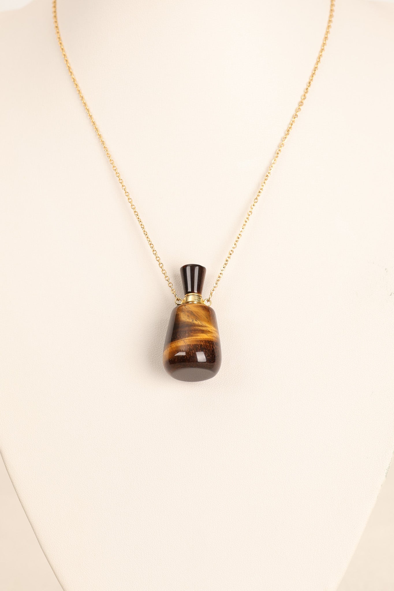 Altın kahverengi çizgili yapısıyla dikkat çeken %100 doğal kaplan gözü taşı, zarif esans haznesi formunda tasarlanarak hem estetik hem de fonksiyonel bir kolye haline getirilmiştir.