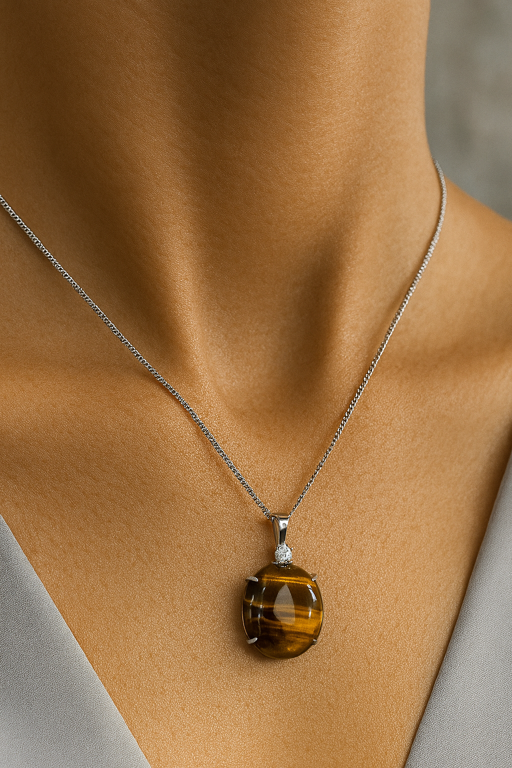 Altın kahverengi yansımaları ve karakteristik çizgili dokusuyla dikkat çeken %100 doğal kaplan gözü taşı, zarif bir kolye tasarımına dönüştü.