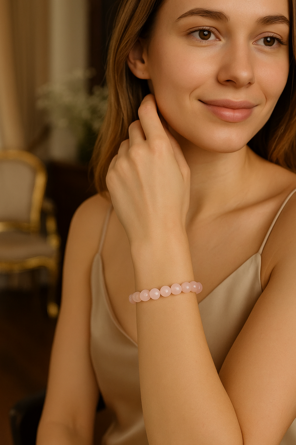 Yumuşak pembe tonlarıyla sade ve şık bir görünüm sunan bu bileklik, doğal pembe kuvars taşlarından özenle hazırlanmıştır. Her biri 10 mm çapında parlak ve yuvarlak taşlar, bileğinizde dengeli bir duruş sağlar.