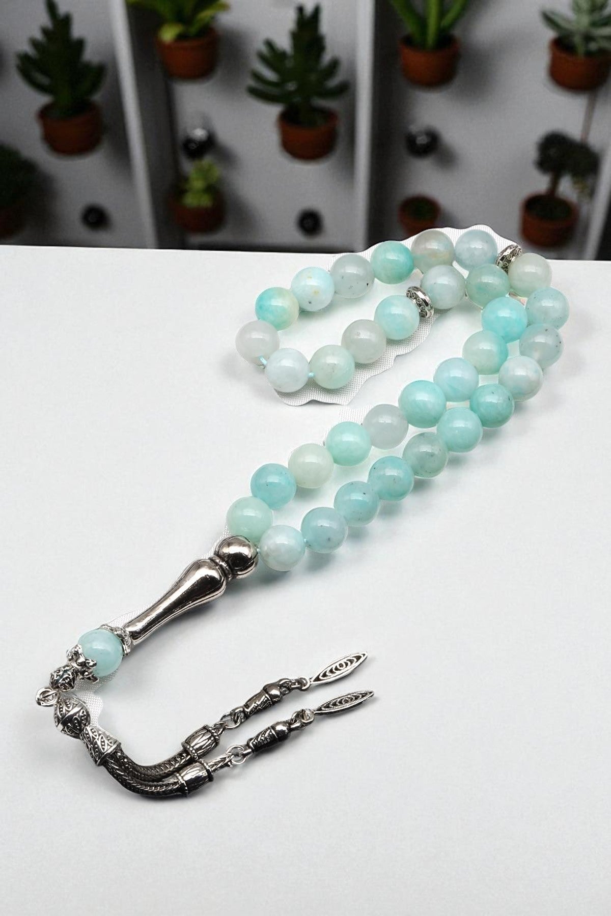 Yumuşak mavi-yeşil tonlarıyla dikkat çeken %100 doğal amazonit taşları, özenle seçilip 8 mm küre kesim formunda işlenerek zarif bir tesbih tasarımına dönüştü.