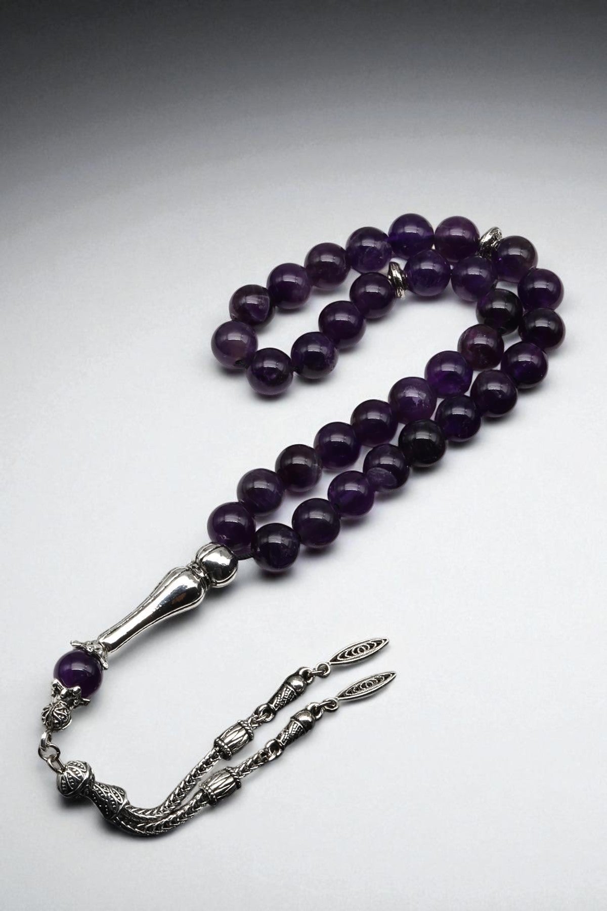 Morun asil tonlarını ve doğal parlaklığını yansıtan %100 doğal ametist taşları, özenle seçilip 8 mm küre kesim formunda işlenerek zarif bir tesbih tasarımına dönüştü.