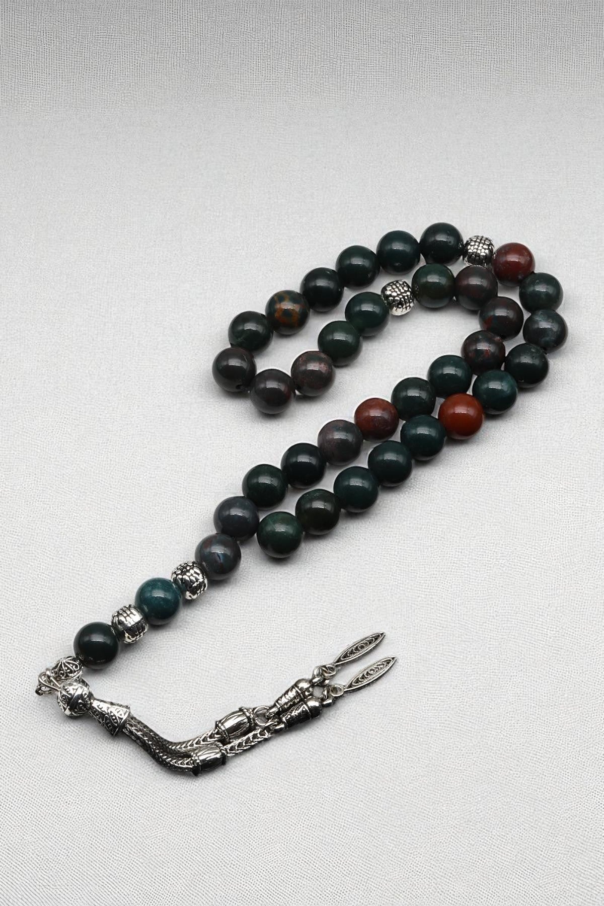 Doğal koyu yeşil zemin üzerinde kırmızımsı tonlarıyla dikkat çeken %100 doğal kan taşı, özenle seçilip 8 mm küre kesim formunda işlenerek şık bir tesbih tasarımına dönüştü.