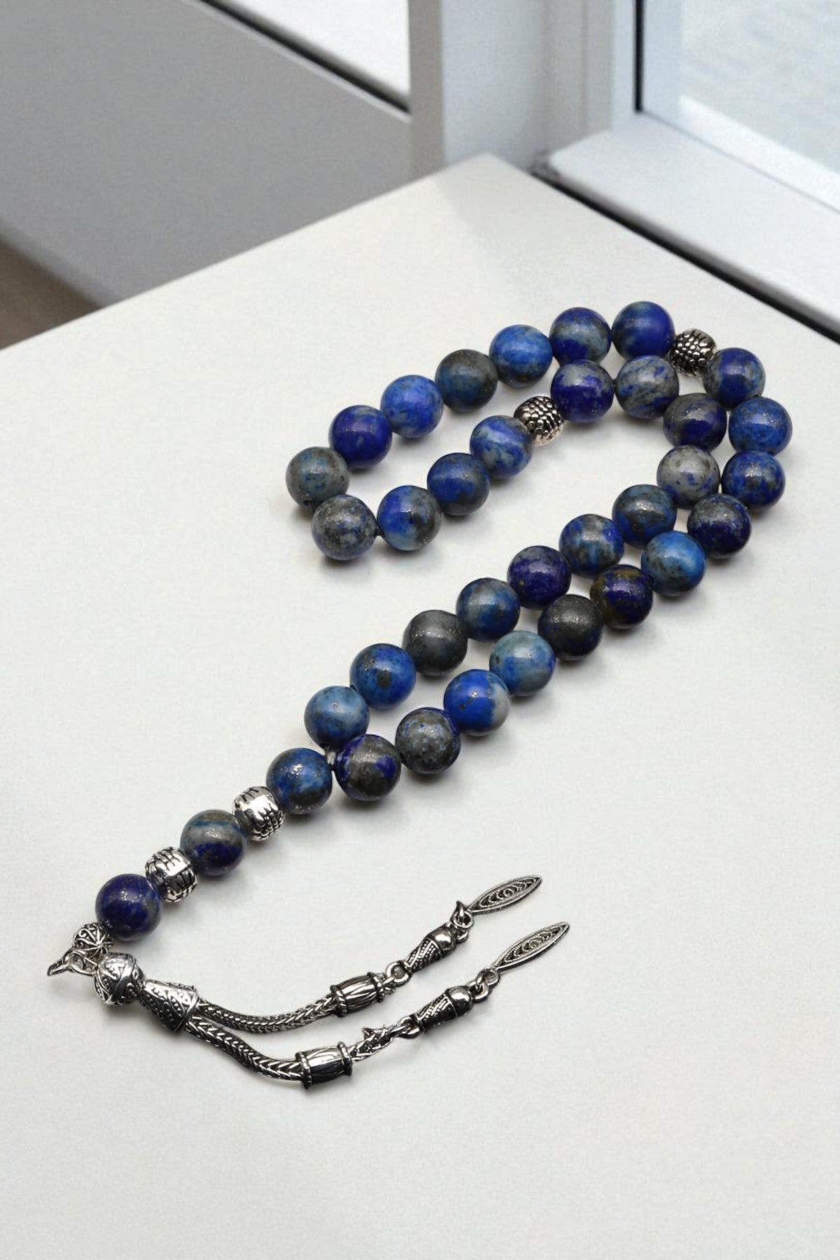 Derin mavi tonları ve doğal pirit yansımalarıyla öne çıkan %100 doğal lapis lazuli taşları, özenle seçilip 8 mm küre kesim formunda işlenerek zarif bir tesbih tasarımına dönüştü.