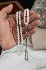 Işık geçirgenliği yüksek, berrak yapısıyla bilinen necef taşı, bu özel tesbihte 6 mm yuvarlak kesim tanelerle hazırlanmış ve toplamda 99 adet doğal taş taneden oluşmuştur. Hafifliği, sade şıklığı ve cam parlaklığındaki görünümüyle hem günlük kullanım hem de özel koleksiyonlar için ideal bir seçenektir.