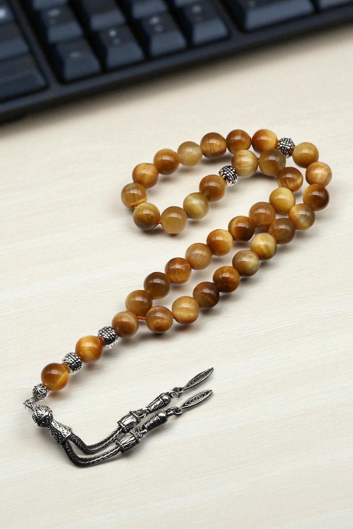 Altın sarısı ve kahverengi tonlarının ışıkla değişen yansımalarıyla öne çıkan %100 doğal sarı kaplan gözü taşları, özenle seçilip 8 mm küre kesim formunda işlenerek zarif bir tesbih tasarımına dönüştü.